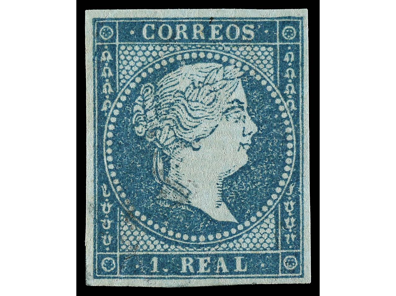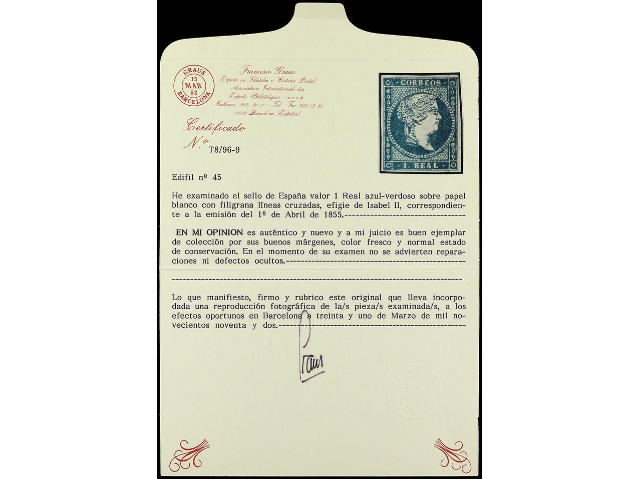 ESPAÑA. 1 real azul, márgenes completos. Muy buen ejemplar. Cert. GRAUS. Se incluye (*) Ed 44. Ed.45. (Image1) (Image2)