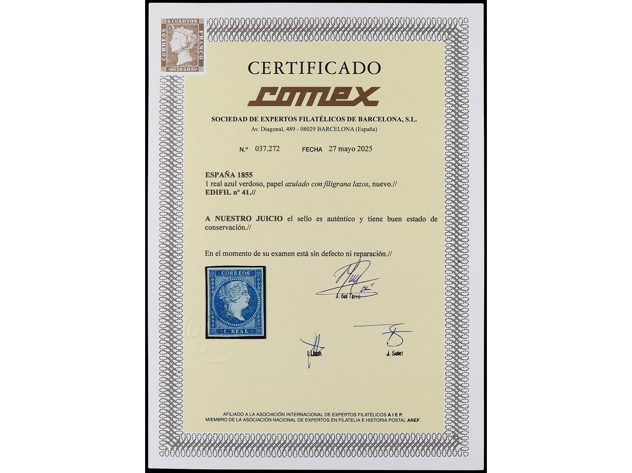 ESPAÑA. 1 real azul verdoso. LUJO. RARO en esta calidad. Cert. COMEX. Ed.41. Cat. +1.900€. (Image1) (Image2)