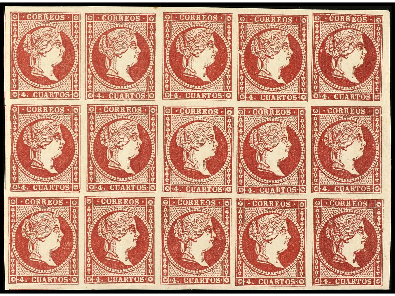 ESPAÑA. 4 cuartos carmín. Bloque de 15 sellos del tipo IV incluyendo en la posición 8 un ejemplar del raro tipo V. PRECIOSO. Ed.48C + 48D. (Image1)