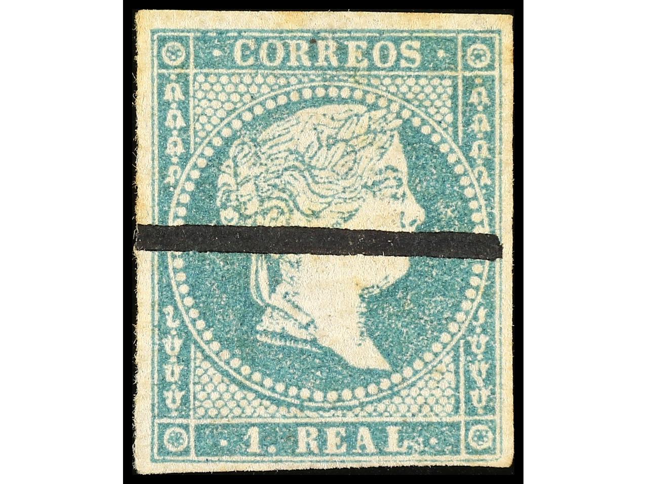 ESPAÑA. 1 real azul, con raya de tinta negra. MUESTRA. MUY RARO. Ed.45M. (Image1)