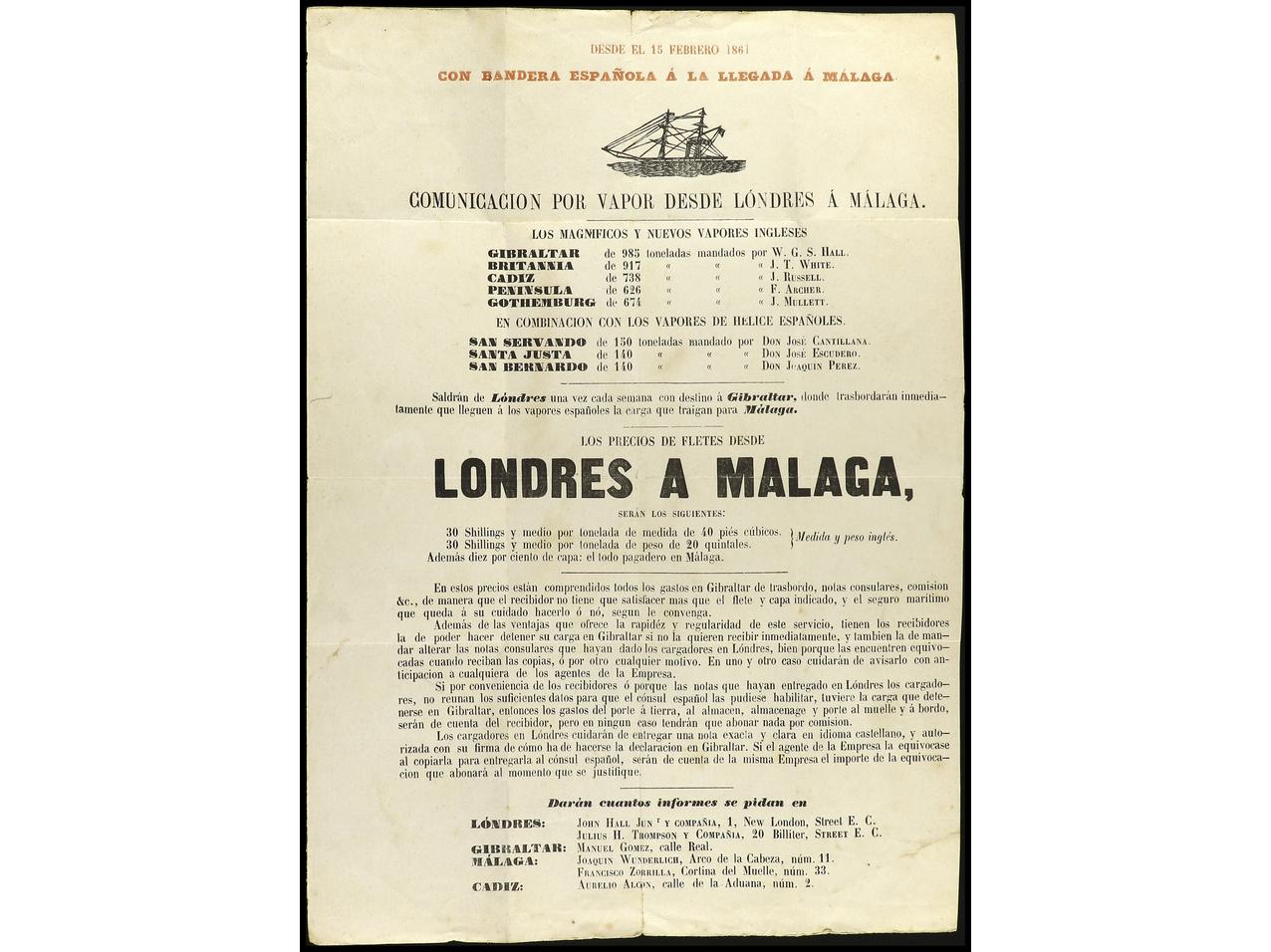 ESPAÑA. 1861. MÁLAGA a GRANADA. 4 cuartos. Interior folleto impreso con la lista de vapores y coste de las flotas entre Londres y Málaga. Inusual envío de publicidad en carta sin utilizar la tarifa de impresos. Ed.52. (Image1) (Image2)