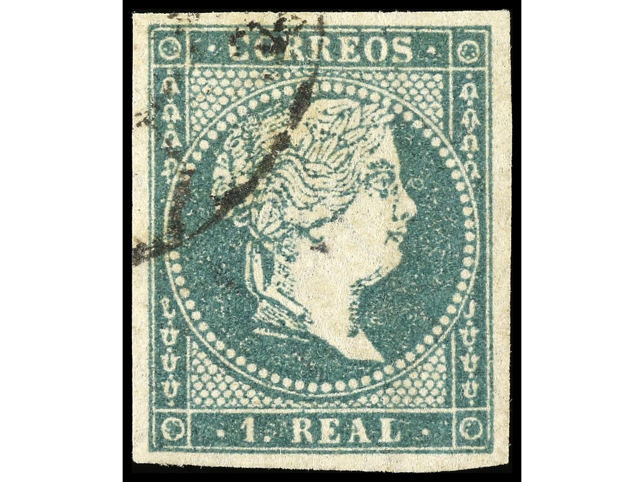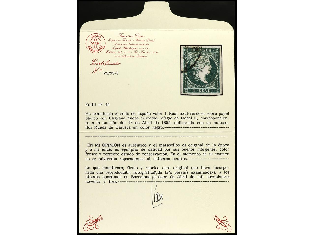 ESPAÑA. 1 real azul verdoso. PIEZA DE LUJO. Cert. GRAUS (ejemplar de calidad). Ed.45. Cat. 260€. (Image1) (Image2)