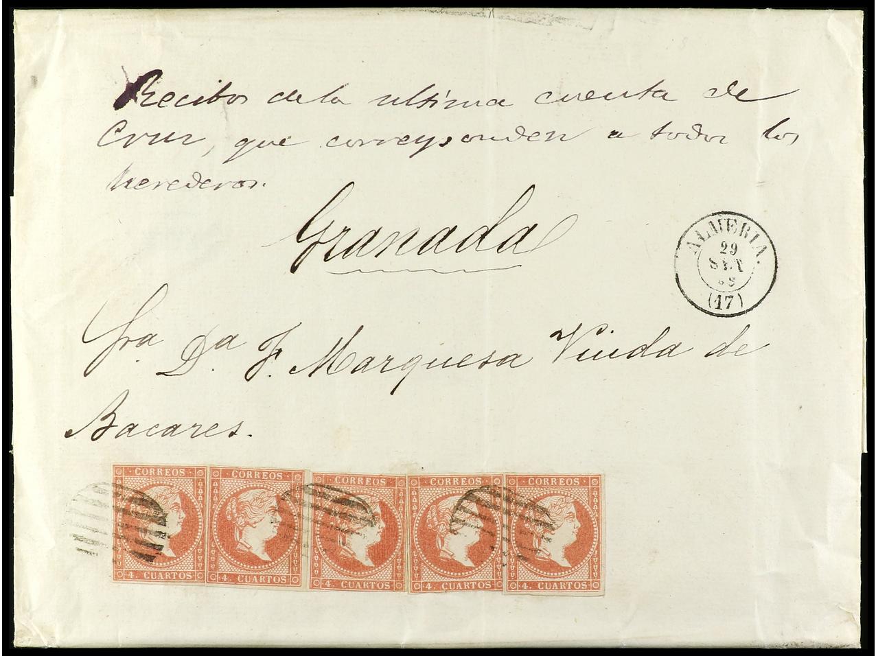 ESPAÑA. 1859. Gran sobre de ALMERÍA a GRANADA. Franqueado con 5 sellos de 4 cuartos rojo. (5 portes). PRECIOSO y RARO. Ed.48. (Image1) (Image2)