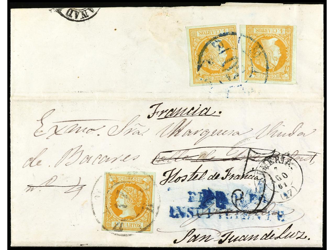 ESPAÑA. 1861. Sobrescrito de ALMERÍA a GRANADA, con sello de 4 c., mat. R.C. 17 de Almería, y redirigida a FRANCIA. Marca FRANQUEO INSUFICIENTE cancelada a titna, al añadir 2 sellos de 4 c. en Irún, mat. R.C. 50 en azul, para completar la