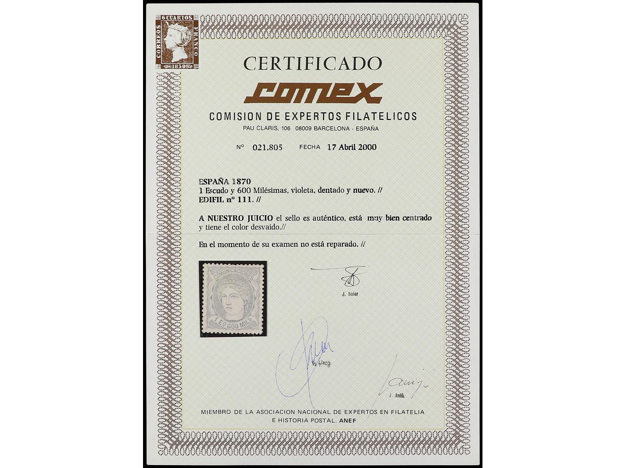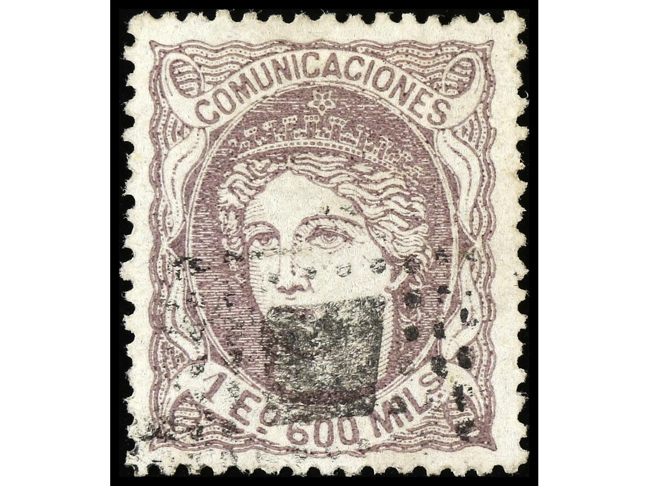 ESPAÑA. 1 Esc. 600 mils. violeta, mat. rombo de puntos. Excepcional color y centraje. Muy rara en esta calidad. LUJO. Cert. CEM. Ed.111. Cat. 1.550€.