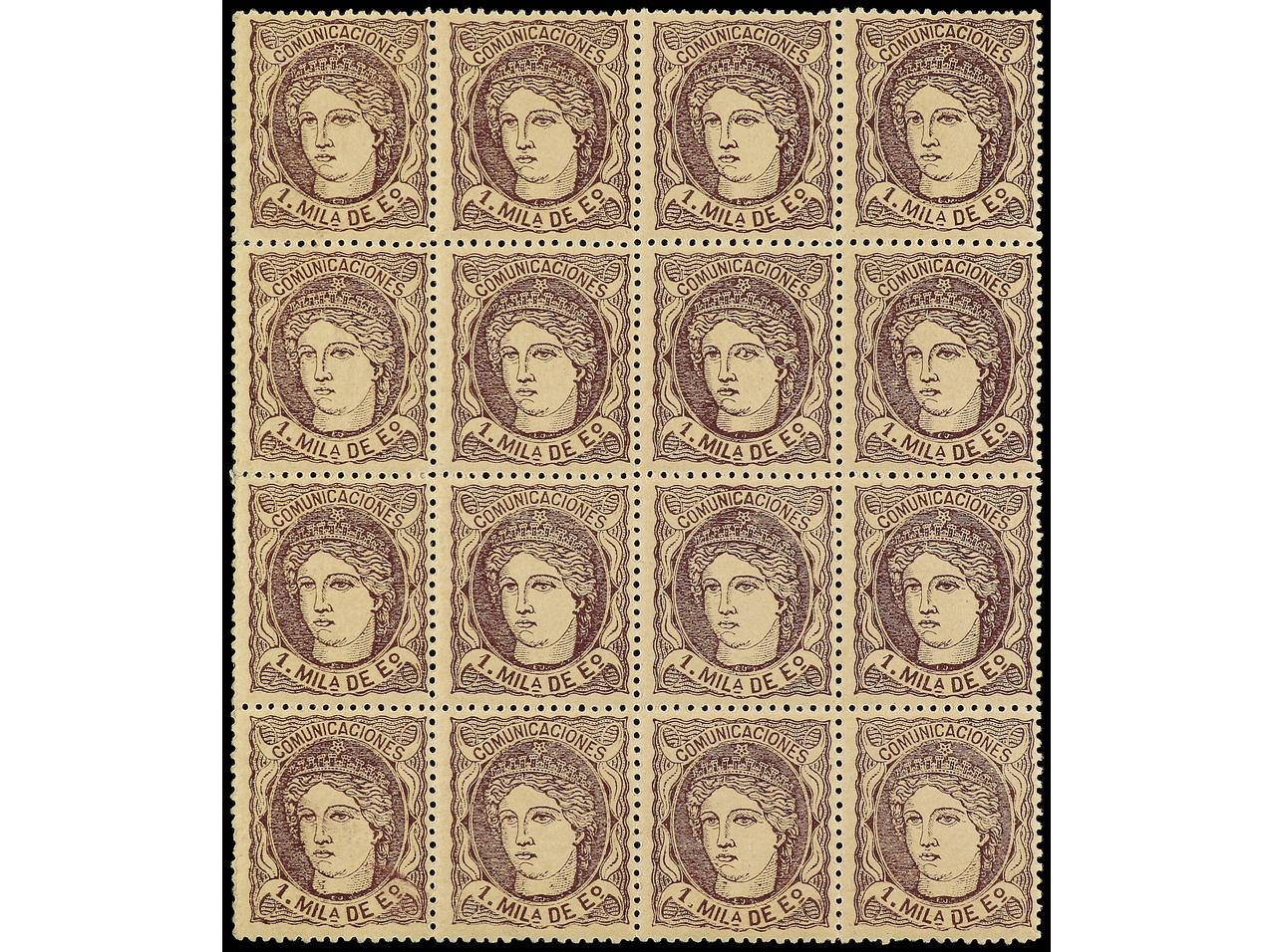 ESPAÑA. 1 mils. castaño s. anteado. Bloque de 16 sellos en nuevo, rara tonalidad de color, excelente centraje. LUJO. Ed.102c (16). (Image1)