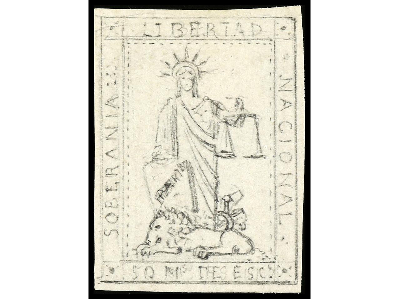 ESPAÑA. 1869. GOBIERNO PROVISIONAL. 2 bocetos no adoptados de 50 mils. realizados a lápiz con leyenda SOBERANÍA NACIONAL y con valor de 50 mils. de Esc. ÚNICOS.