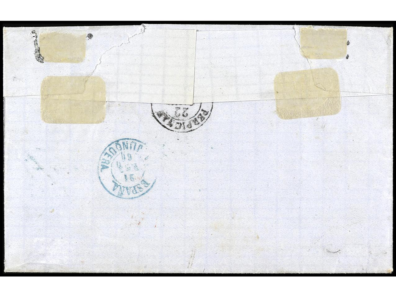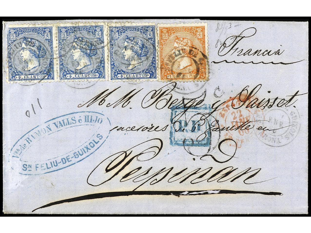 ESPAÑA. 1866. SAN FELIU DE GUÍXOLS a FRANCIA. 4 cuartos azul (3) y 12 cuartos naranja. Preciosa combinación de franqueo. Ed.81 (3), 82. (Image1) (Image2)