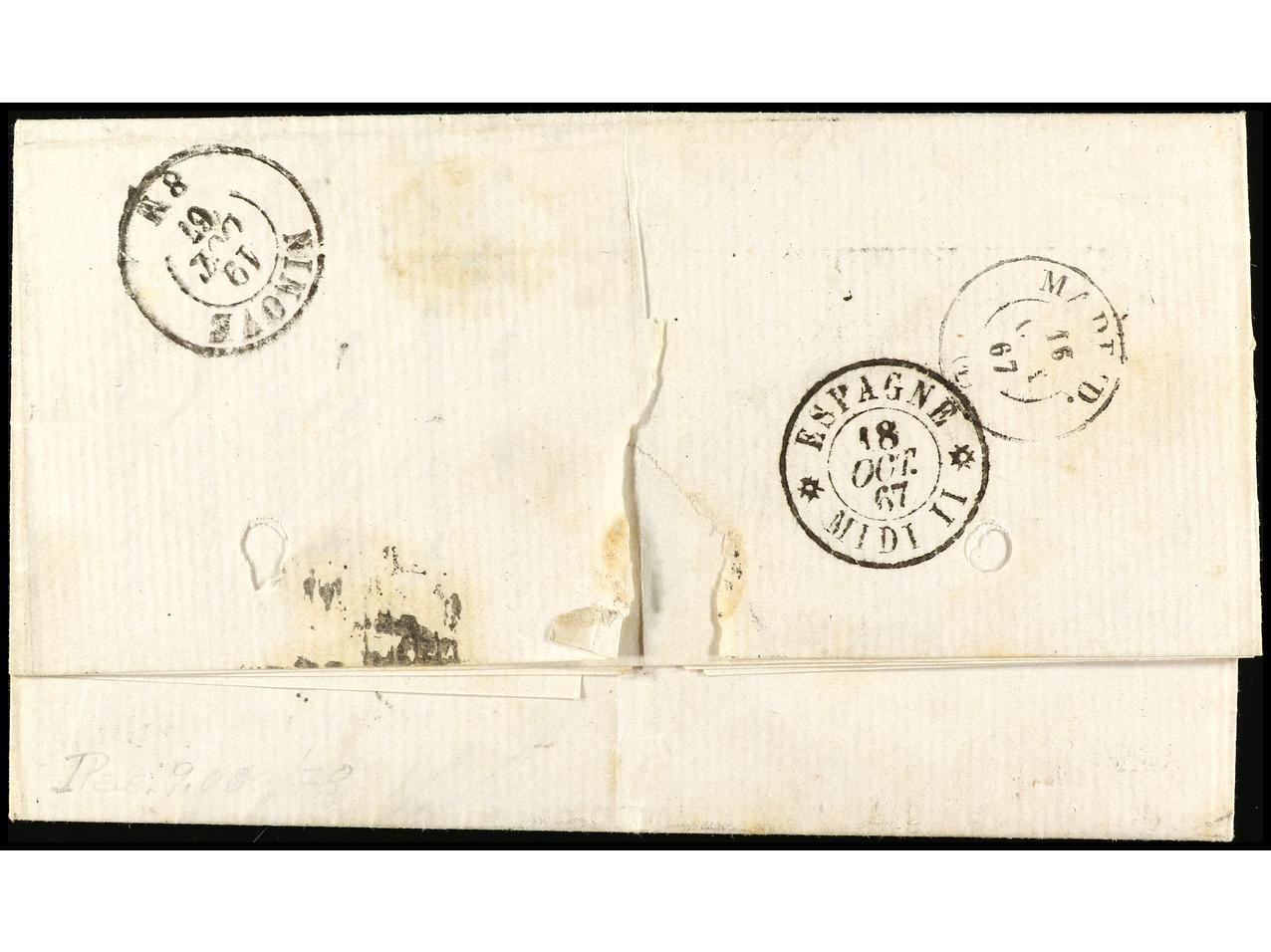 ESPAÑA. 1867. ALMERÍA a TÚNEZ. Sobre sin franquear, con tránsitos en Madrid, San Juan de Luz, Burdeos, Marsella, Argelia y llegada después de 25 días. Curiosa.