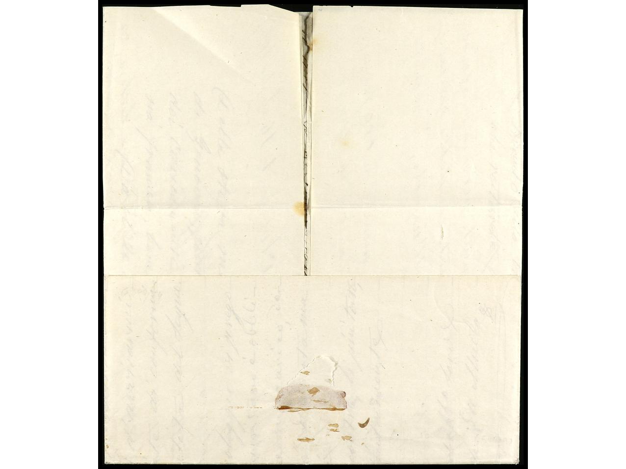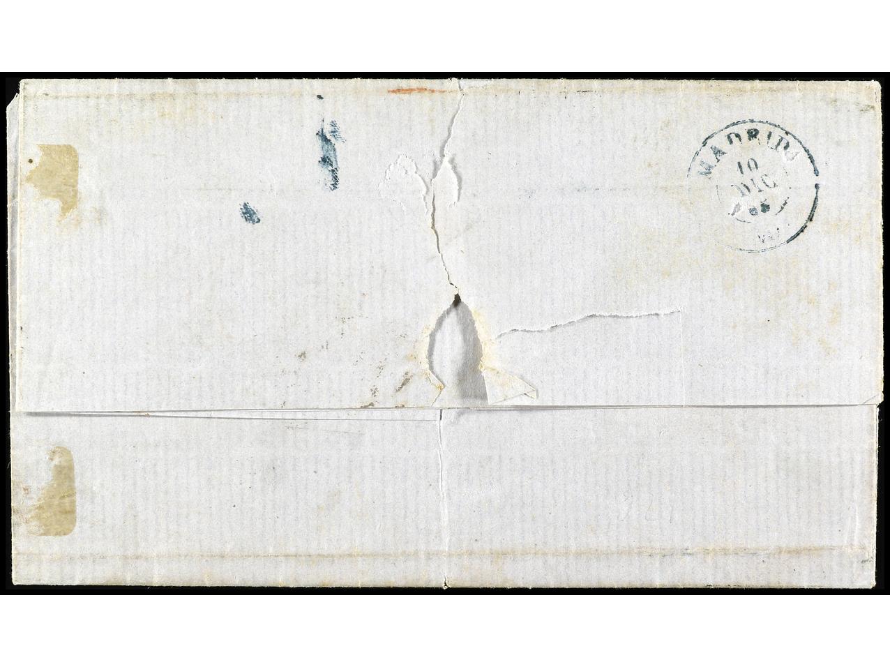 ESPAÑA. 1865. MÁLAGA a LA GUAYRA (Venezuela). 2 reales violeta, pareja. Mat. CORDOBA a MALAGA/AMBTEASCTE. Circulada via Inglaterra, pliegue de archivo. Carta con muy rara destinación en esta emisión y con el raro fechador del Ferrocarril.