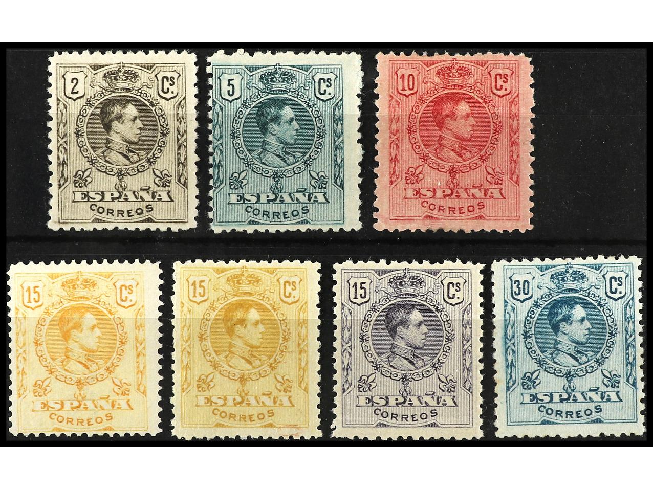 ESPAÑA. 2 cts. sepia, 5 cts. verde, 10 cts. rojo, 15 cts. amarillo (numeración en azul y rojo), 15 cts. violeta y 30 cts. verde. Numeración A000.000. Ed.267/71N, 271Na, 275N. Cat. 157€. (Image1)