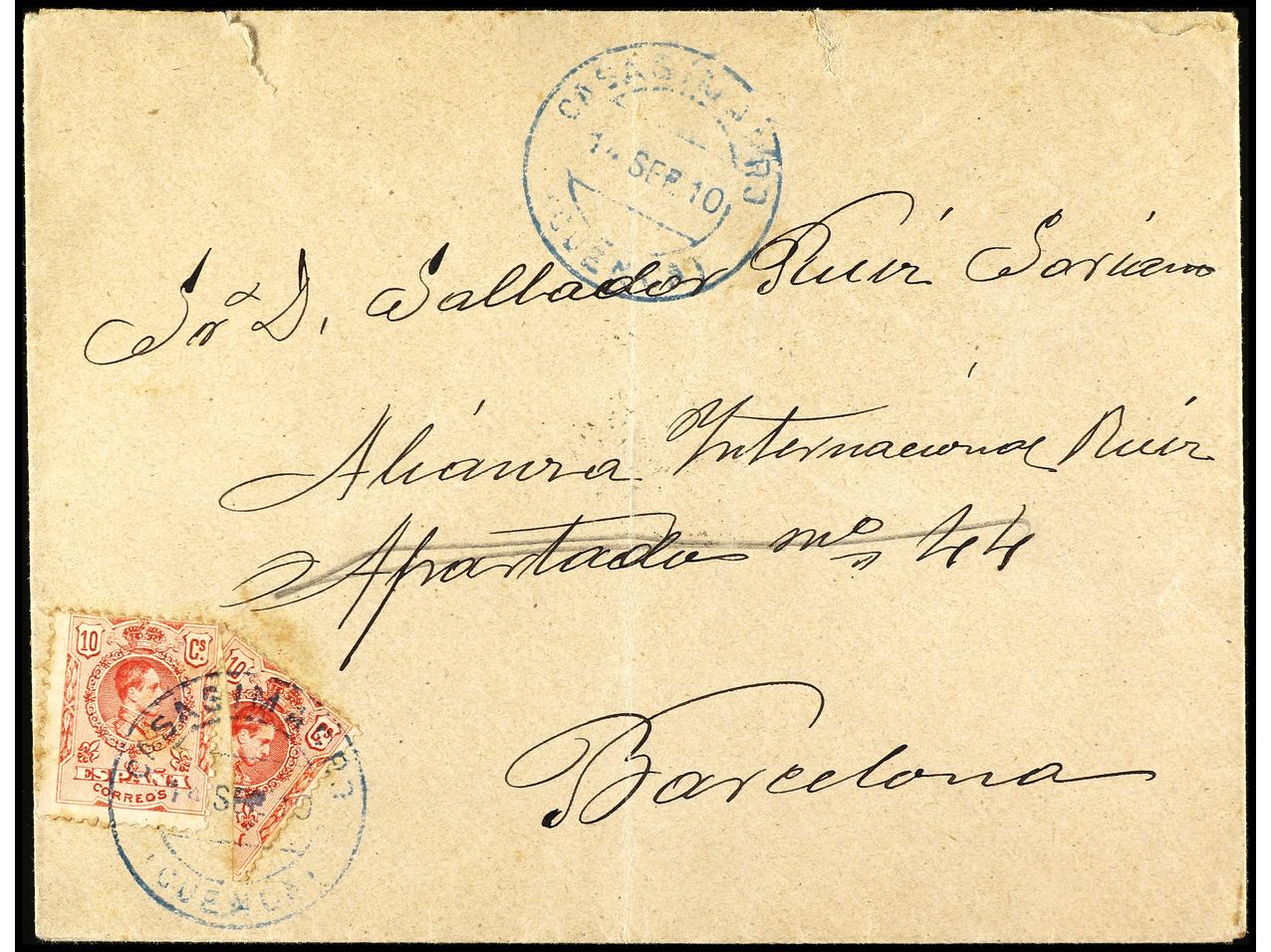 ESPAÑA. 1910. CASASIMARRO (Cuenca) a BARCELONA. 10 cts. rojo y sello bisectado de 10 cts. para completar la tarifa de 15 cts. Ed.269. (Image1) (Image2)