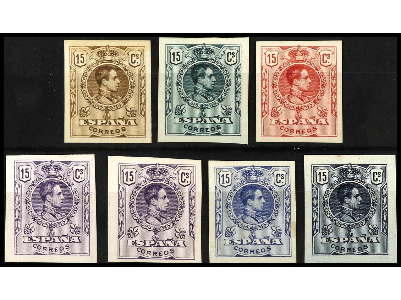 ESPAÑA. ENSAYOS DE COLOR procedentes de las pruebas de punzón. Conjunto de siete sellos verde, rojo, violeta, violeta oscuro, azul y azul oscuro. (Gálvez 1855, 1857/1862). (Image1) (Image2)