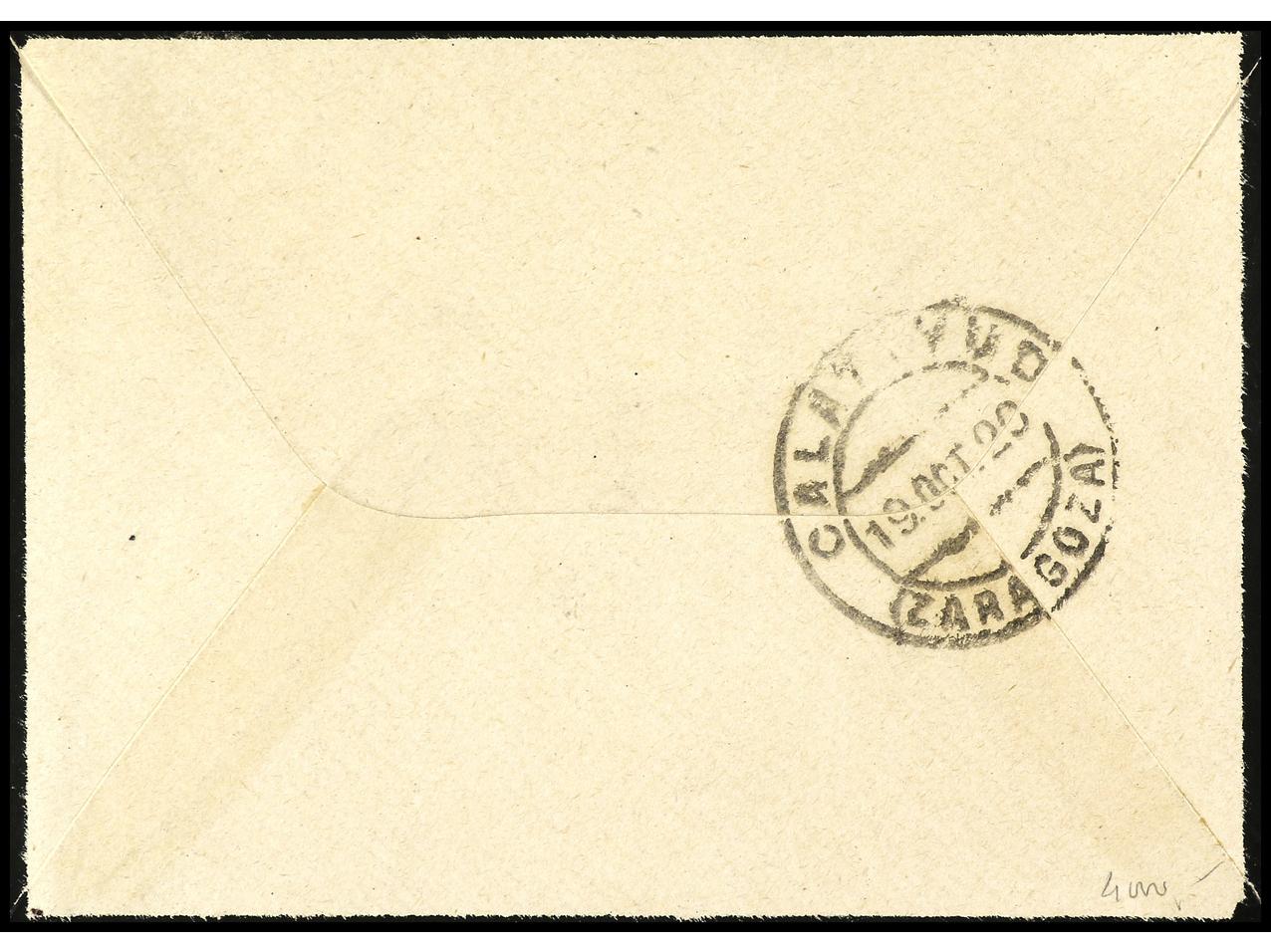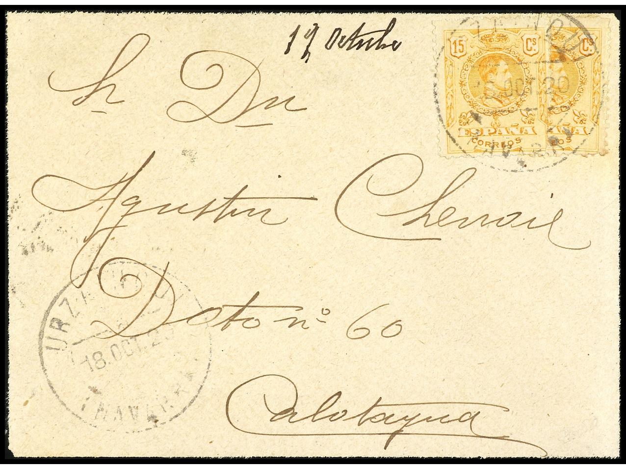 ESPAÑA. 1920. URZAINQUI (Navarra) a CALATAYUD. 15 cts. amarillo y sello bisectado de 15 cts. para completar la tarifa de 20 cts. con sobrepago de 2 1/2 cts. RARA. Ed.271 (2). (Image1) (Image2)