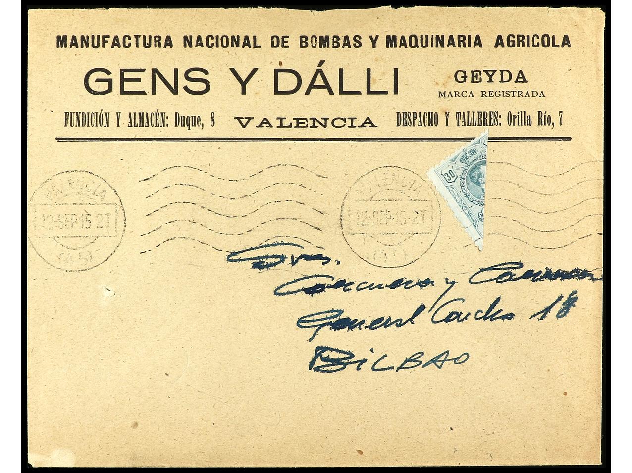 ESPAÑA. 1915. VALENCIA a BILBAO. Circulada con sello bisectado de 30 cts. verde bisectado para ser usado como 15 cts. Ed.275. (Image1) (Image2)