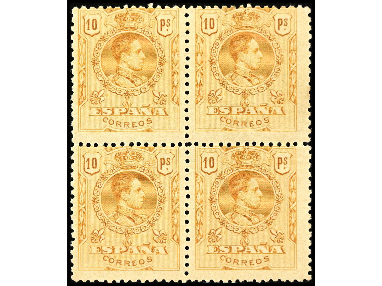ESPAÑA. 10 pts. naranja. A 000,000. Bloque de cuatro. Sellos inferiores sin fijasellos. Cert. COMEX. Ed.280. (Image1) (Image2)