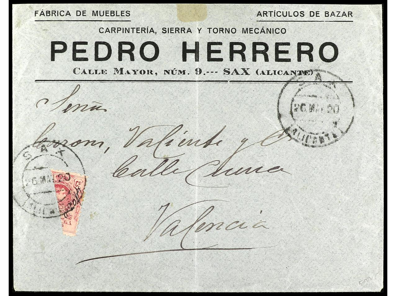 ESPAÑA. 1920. SAX a VALENCIA. Circulada con sello de 40 cts. rosa bisectado para ser usado como 20 cts., indicación manuscrita sobre el sello ´0,20 pts´ a modo de habilitación. MUY RARA. Ed.276. (Image1) (Image2)