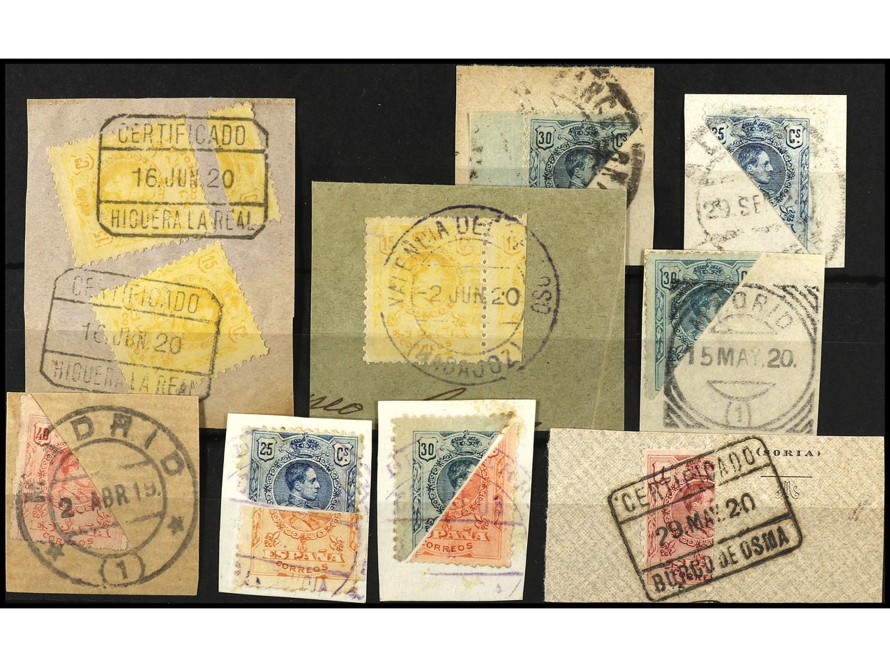 ESPAÑA. 1909-22. ALFONSO XIII. Dos fichas con 18 fragmentos con diversos sellos de la emisión de Medallón. MUY INTERESANTE CONJUNTO. (Image1) (Image2)