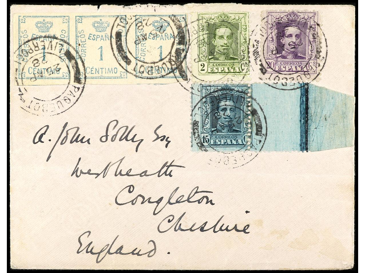 ESPAÑA. 1928. Sobre circulado probablemente desde las Islas Canarias con sellos de 1 cto. (3), 2 cts., 15 cts. y 20 cts. completando la tarifa de 40 cts. mat. a la llegada PAQUEBOT/LIVERPOOL. PRECIOSA. Ed.291 (3), 310, 315, 316. (Image1) (Image2)