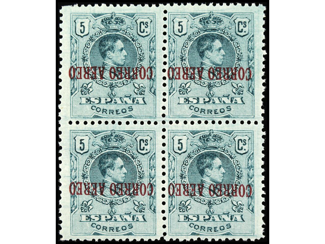 ESPAÑA. 5 cts. verde. Bloque de 4 con HABILITACIÓN INVERTIDA. Ed.292hi (4). Cat. +520€. (Image1)