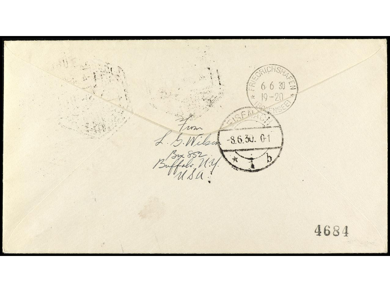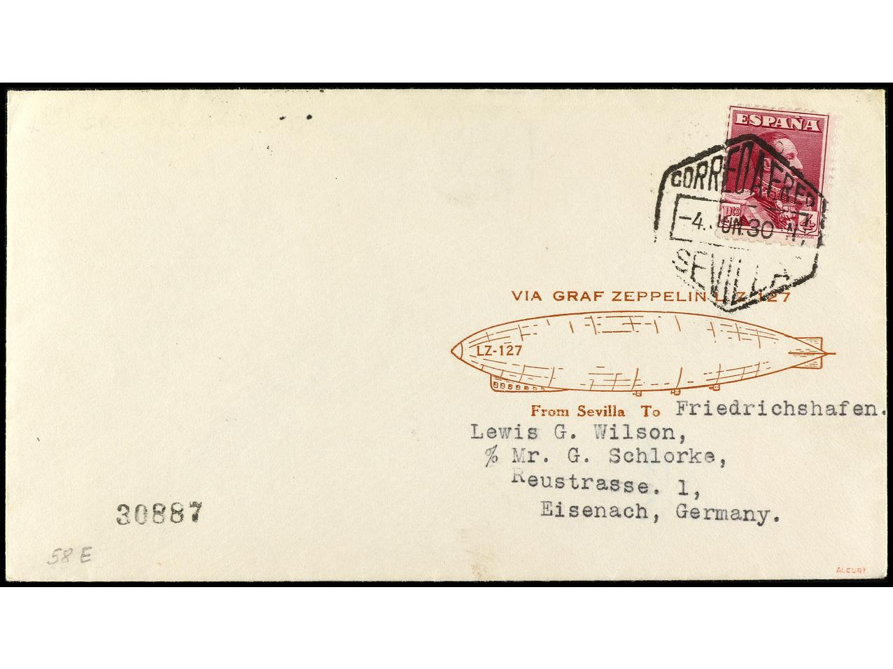 ESPAÑA. 1930. SEVILLA a ALEMANIA. 4 pts. violeta, circulada por Graf Zeppelin, marca del vuelo impresa en rojo. Muy rara sobre Zeppelin español, al dorso llegada. Ed.322. (Image1) (Image2)