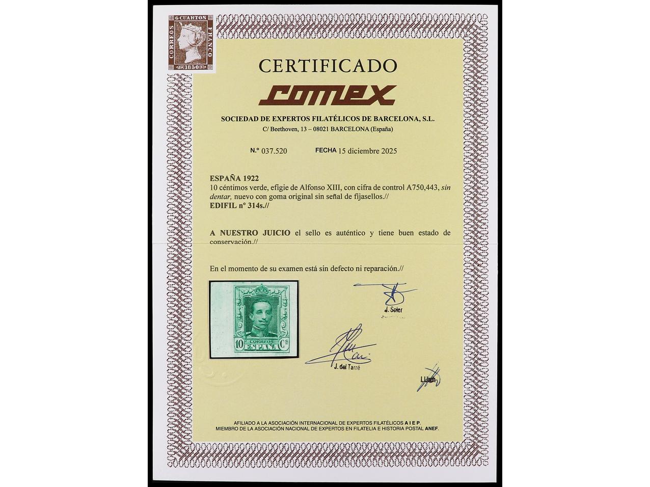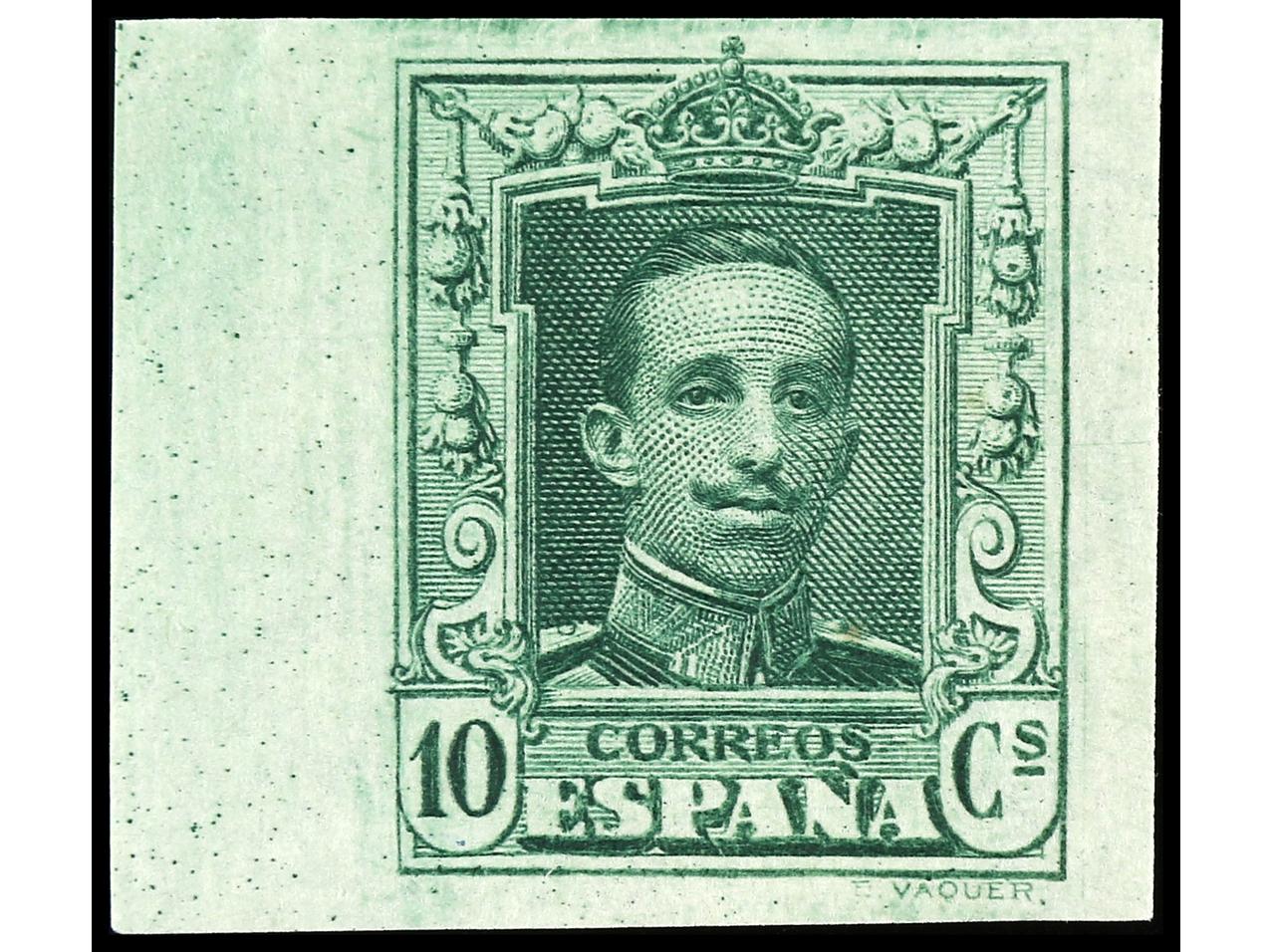 ESPAÑA. 10 cts. verde SIN DENTAR al dorso numeración auténtica A750,443. MUY RARO y no reseñado. Cert. COMEX. Ed.314s. (Image1) (Image2)