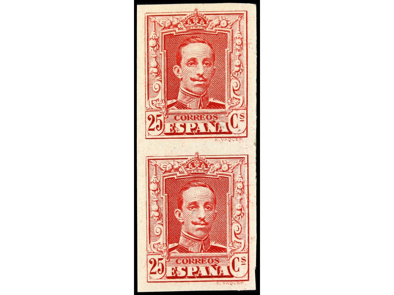 ESPAÑA. 25 cts. rojo. Pareja vertical SIN DENTAR, al dorso numeración auténtica I576,266, sello inferior leve corte. RARO. Ed.317As. (Image1) (Image2)