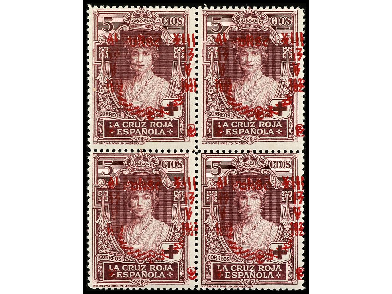 ESPAÑA. 5 cts. castaño violáceo. Bloque de cuatro HABILITACIÓN DOBLE. Ed.351hh (4). Cat. +200€. (Image1)