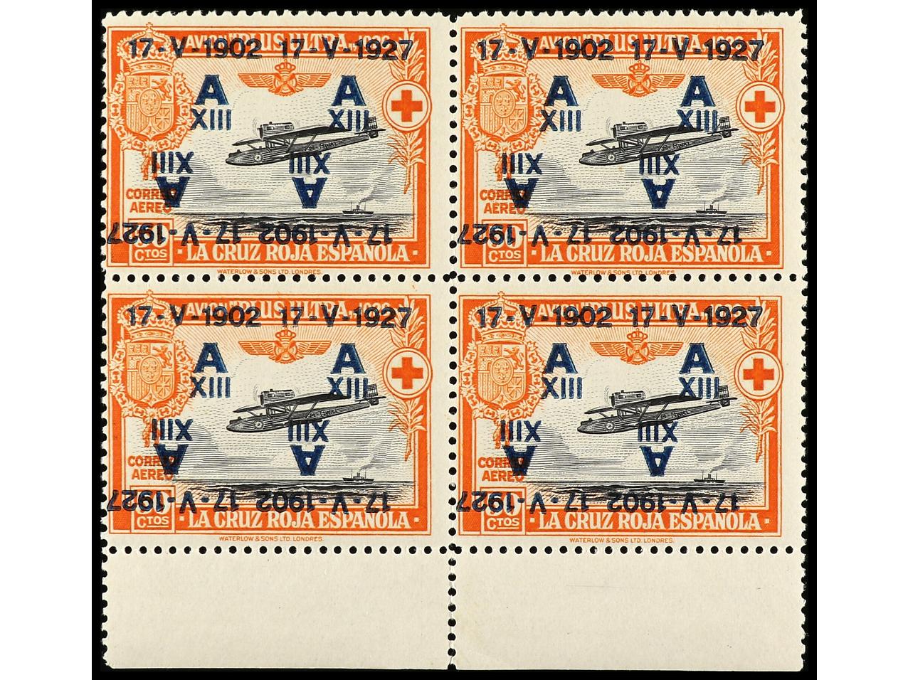 ESPAÑA. 50 cts. naranja y negro. Bloque de 4 con HABILITACIÓN DOBLE, UNA INVERTIDA. Ed.370hhi (4). Cat. +360€. (Image1)