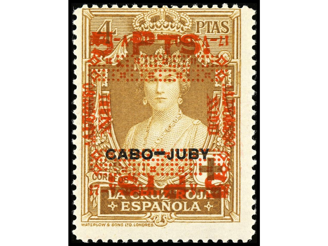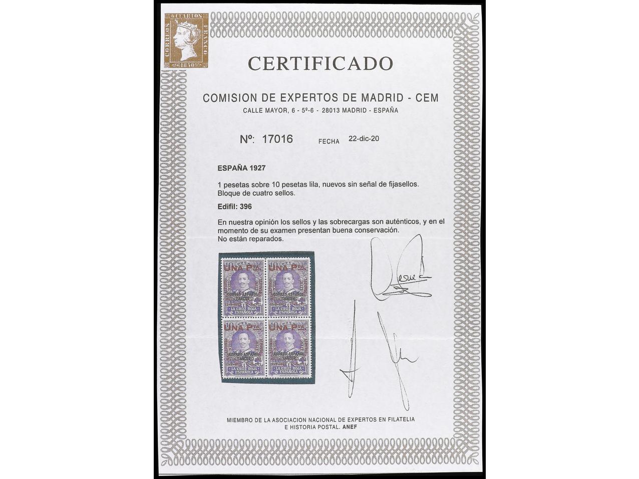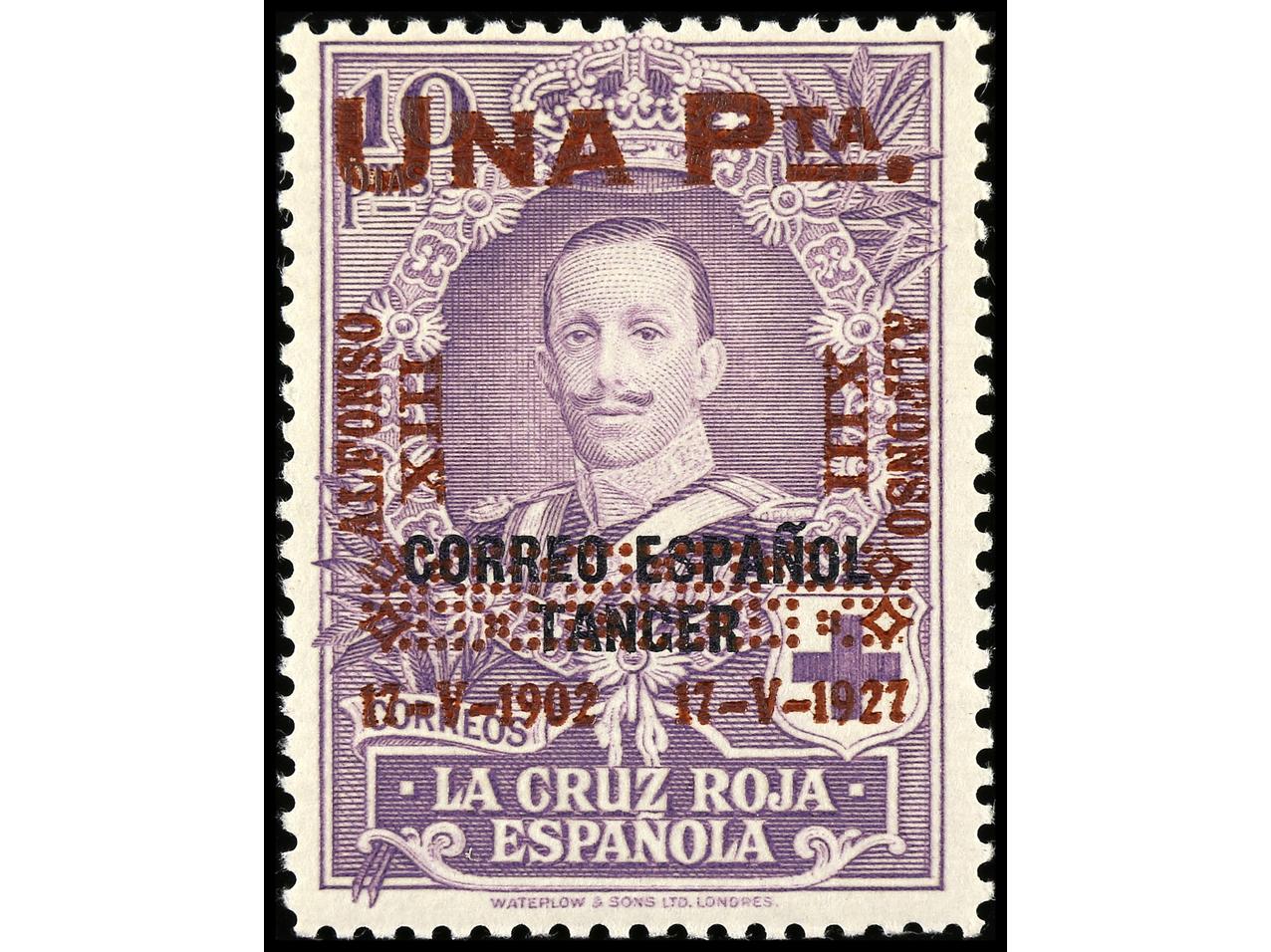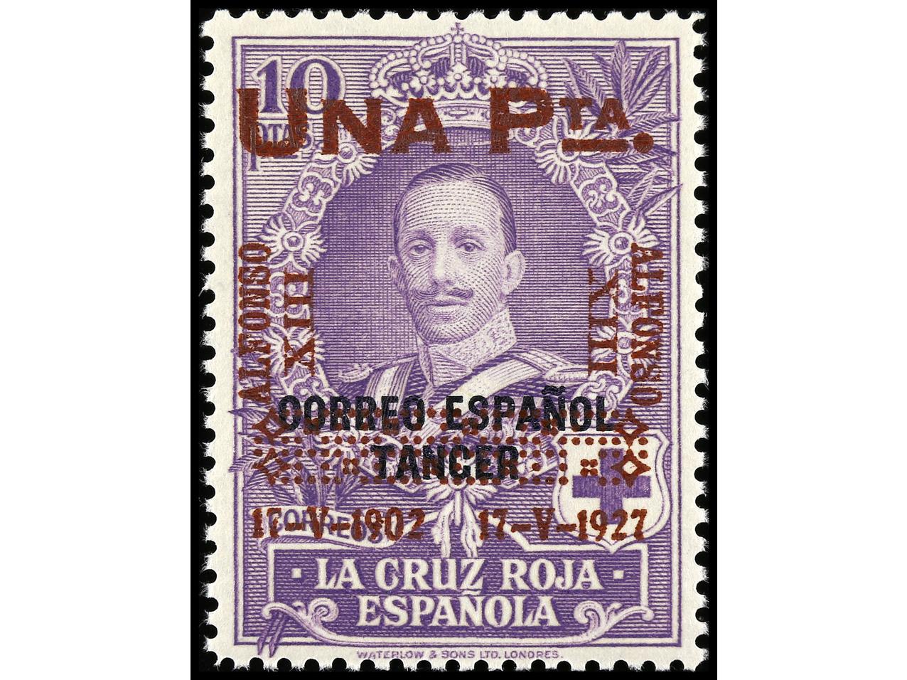 ESPAÑA. 1 pta. s. 10 pts. (Tánger). Valor clave de la serie. RARO y de LUJO. Cert. CEM (fotocopia del bloque de cuatro de donde procede). Ed.396. Cat. +415€.