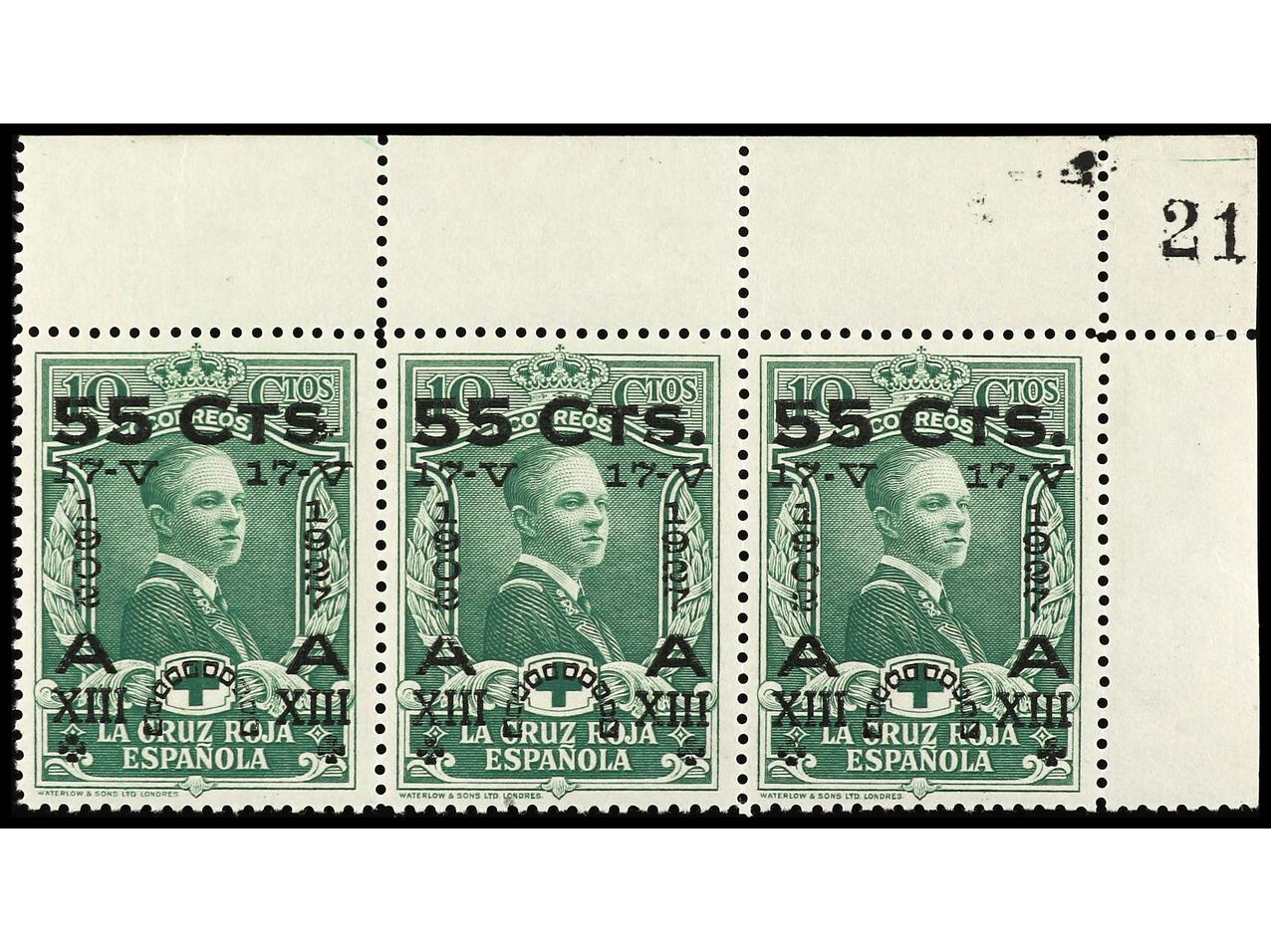 ESPAÑA. 55 cts. s. 10 cts. verde. Tira de 3, un sello SIN PUNTO DESPUÉS DE ´CTS´. Ed.378t+378(2). Cat. +287€. (Image1)