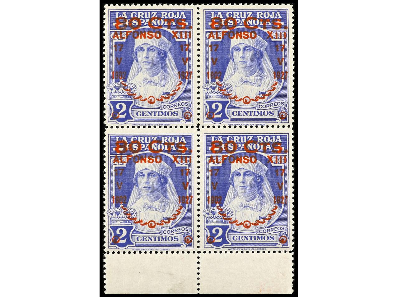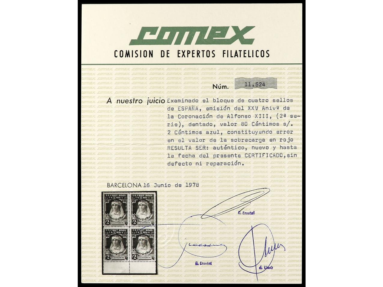 ESPAÑA. 80 cts. s. 2 cts. azul celeste. Bloque de cuatro HABILITACIÓN SOBRE OTRO SELLO. LUJO. Cert. COMEX (1978). Ed.382hz. Cat. +776€. (Image1) (Image2)