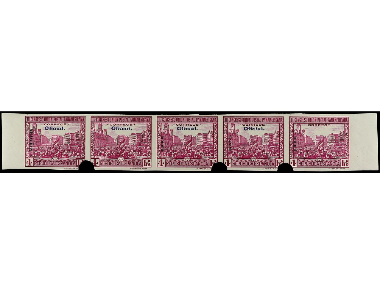 ESPAÑA. 4 pts. violeta SIN DENTAR. Tira horizontal de cinco ejemplares, uno con habilitación MUESTRA, uno SIN HABILITACIÓN, dos con habilitación CUPP y el último con habilitación CUPP sin ´Oficial´. Todos con perforación angular.