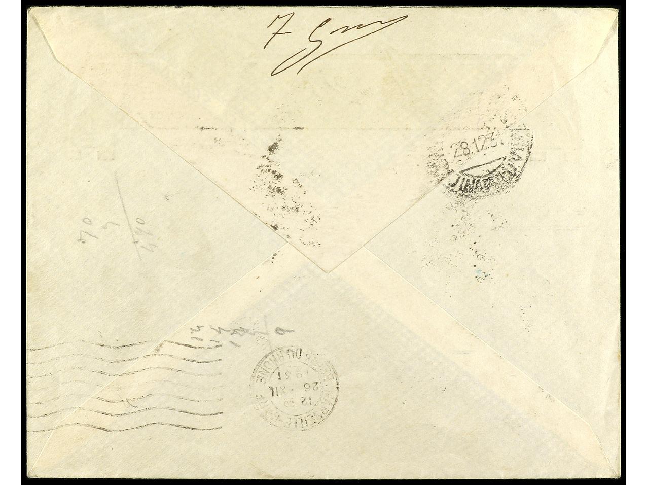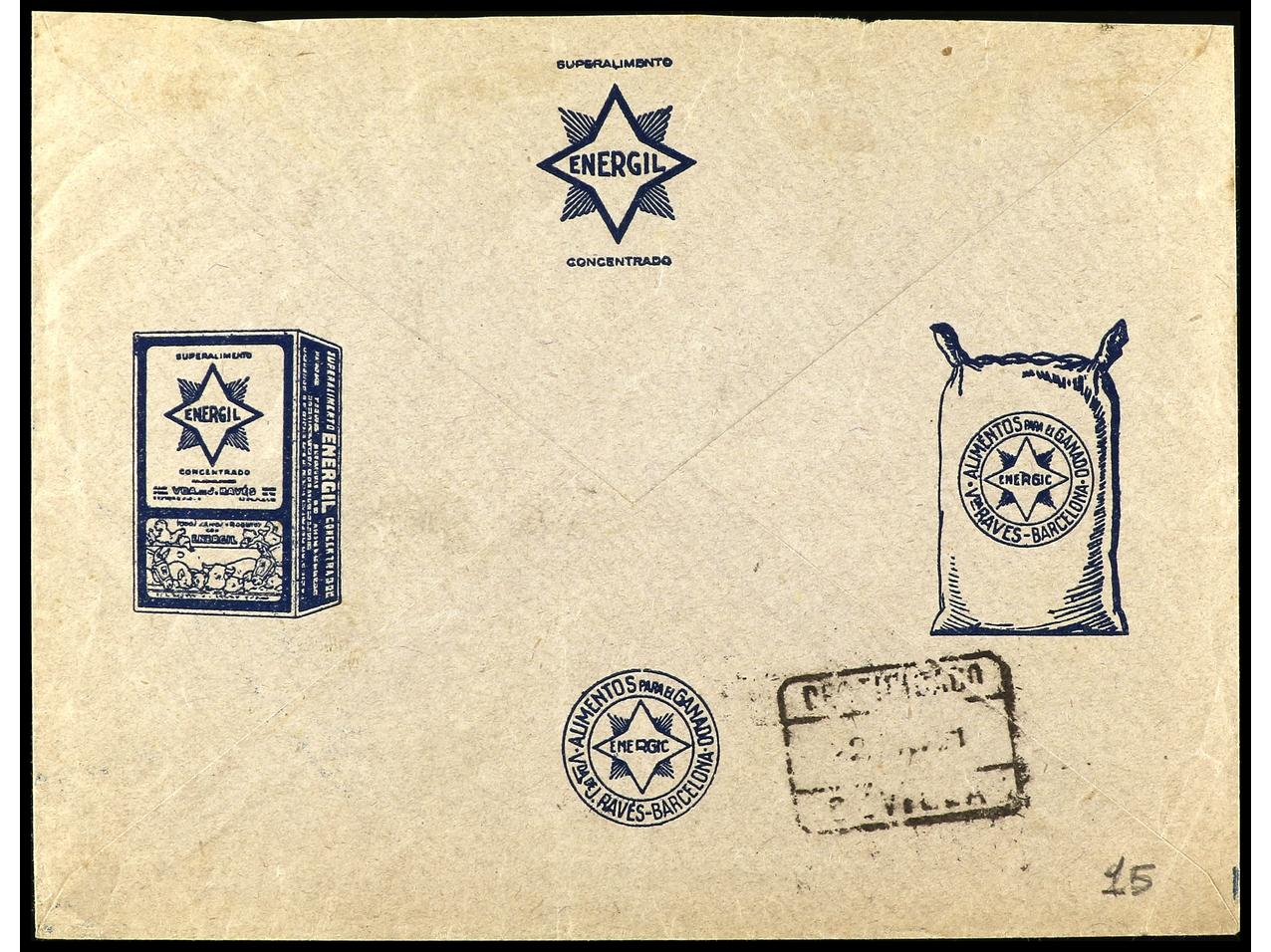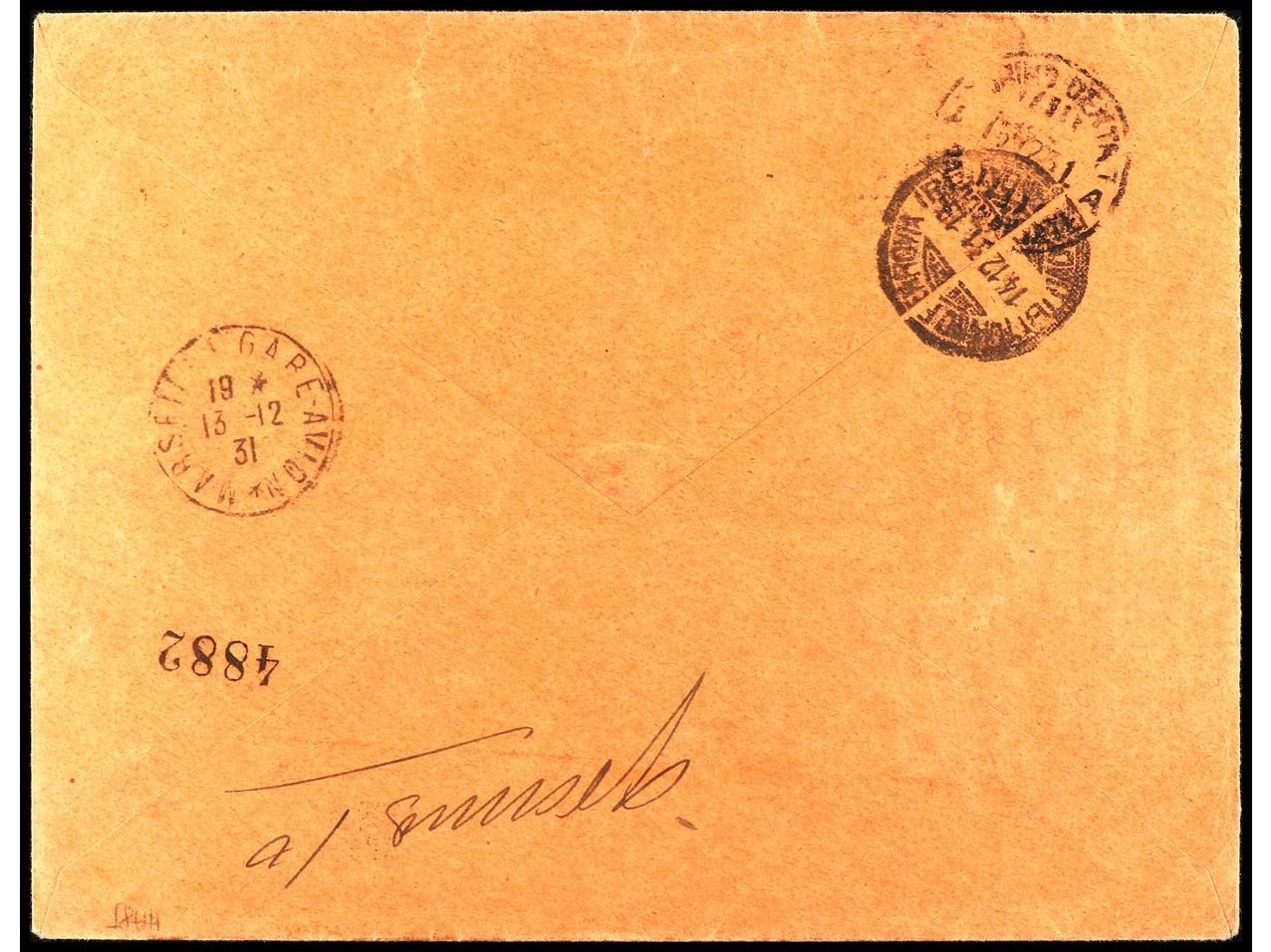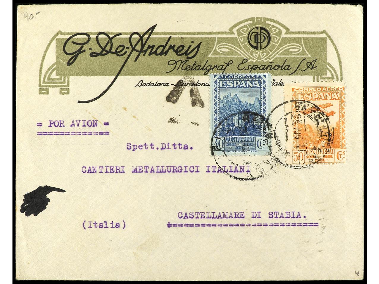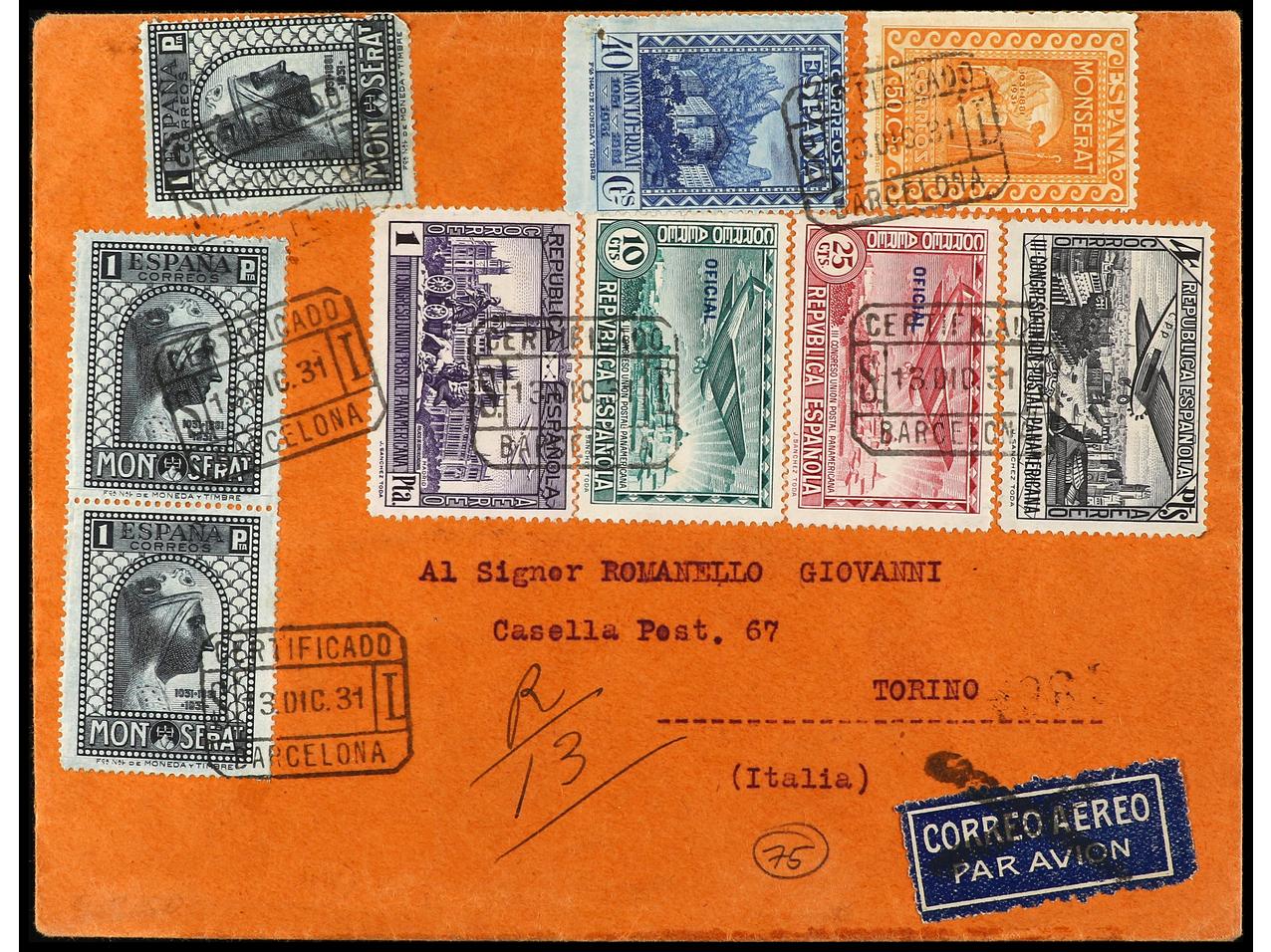 ESPAÑA. 1931. BARCELONA a ITALIA. 40 cts., 50 cts. y 1 pta. (3) más cuatro sellos del Servicio Oficial. Muy rara combinación de franqueo en carta circulada, al dorso llegada. Ed.644, 645, 646 (3), 631/32, 634/35. (Image1) (Image2)