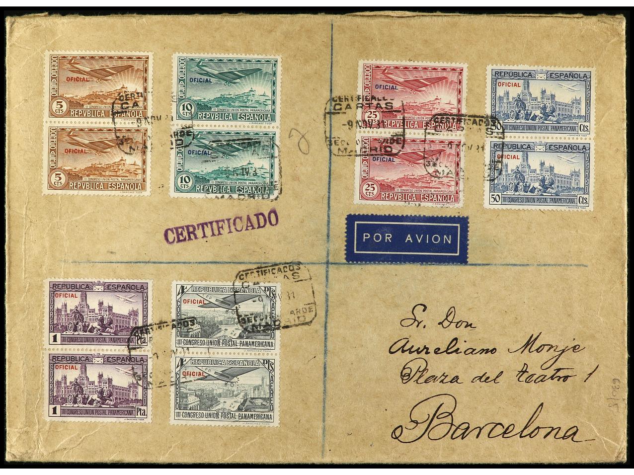 ESPAÑA. 1931. MADRID a BARCELONA. Carta circulada con dos series del Servicio Oficial. RARÍSIMOS sellos en carta verdaderamente circulada, al dorso llegada. Ed.630/35 (2). (Image1) (Image2)