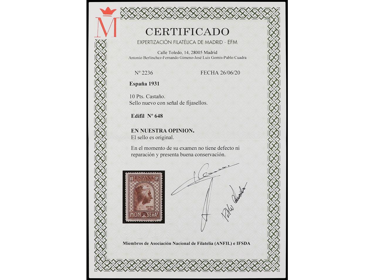 ESPAÑA. 10 pts. castaño. Muy buen ejemplar. Raro sin fijasellos. Ed.648. Cat. 740€. (Image1)