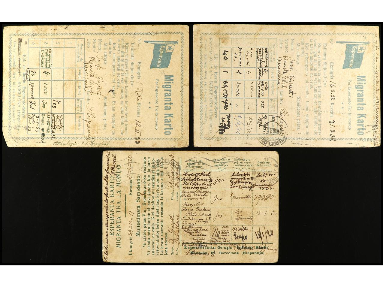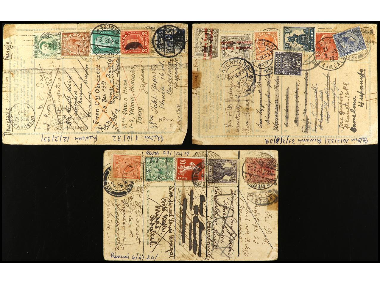 ESPAÑA. 1920-32. 3 tarjetas en Esperanto circuladas desde ESPAÑA con sucesivas reexpediciones a FRANCIA, ALEMANIA, GRAN BRETAÑA, POLONIA, U.S.A. y JAPÓN.