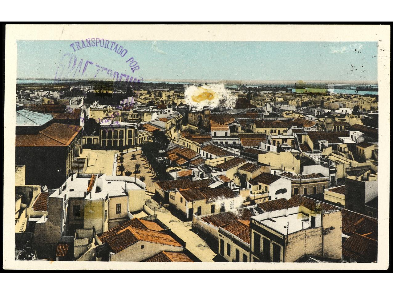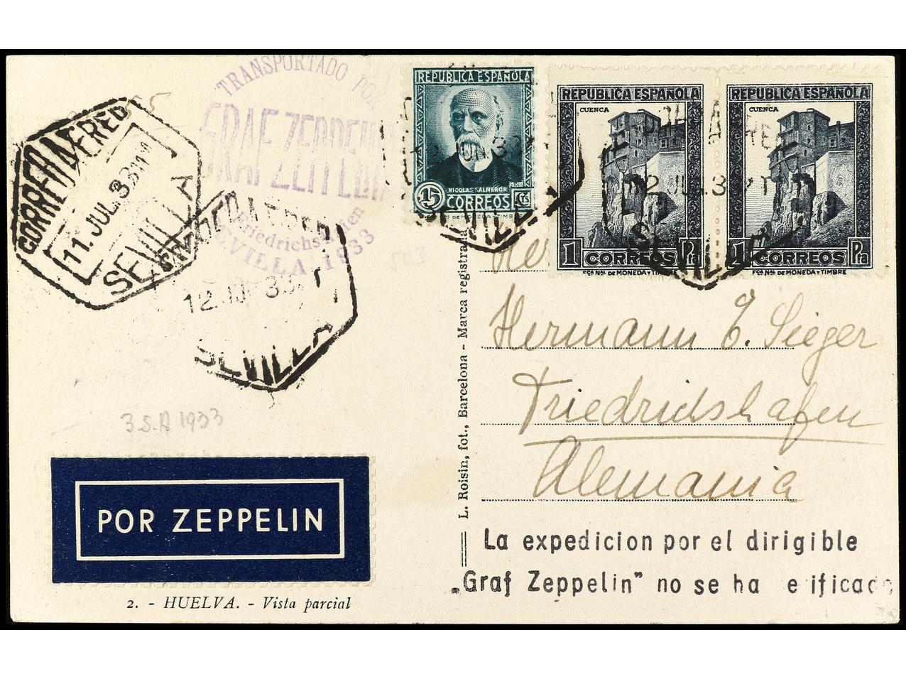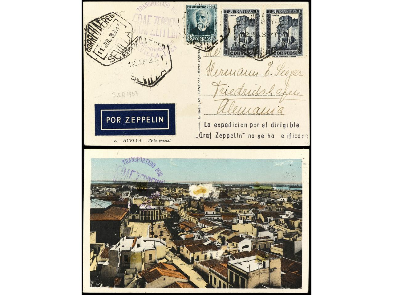 ESPAÑA. 1933. Tarjeta postal. SEVILLA a ALEMANIA. 15 cts. + 1 pta. (2). Marcas GRAF ZEPPELIN pese a no haber circulado por este medio. Marca ´La expedición por el dirigible ´Graf Zeppelin´ no se ha verificado´. RARA. Ed.665 + 673