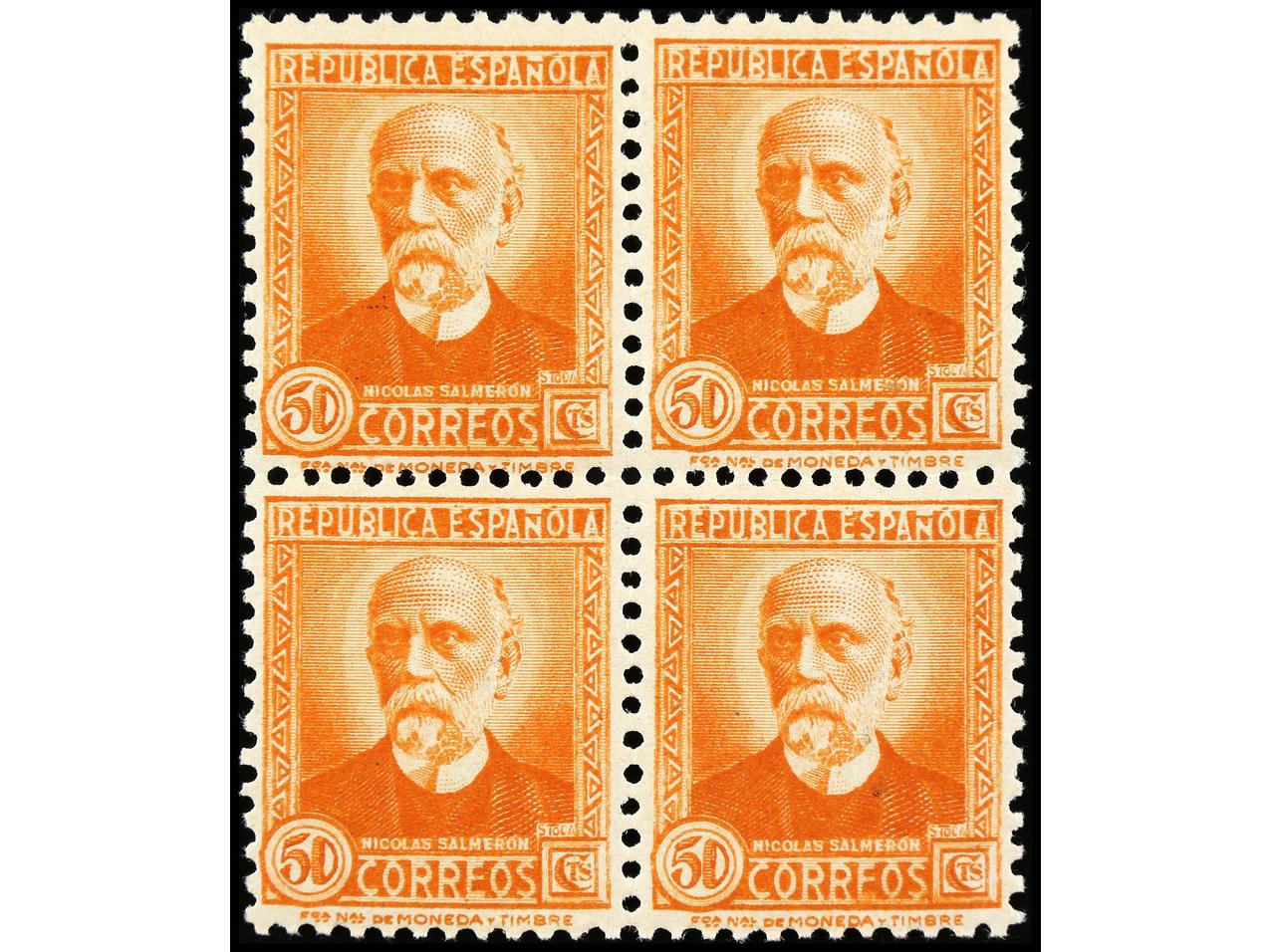 ESPAÑA. 50 cts. naranja. Bloque de cuatro. PIEZA DE LUJO. Un sello transparencia propia del papel. Ed.661 (4). Cat. +640€. (Image1)