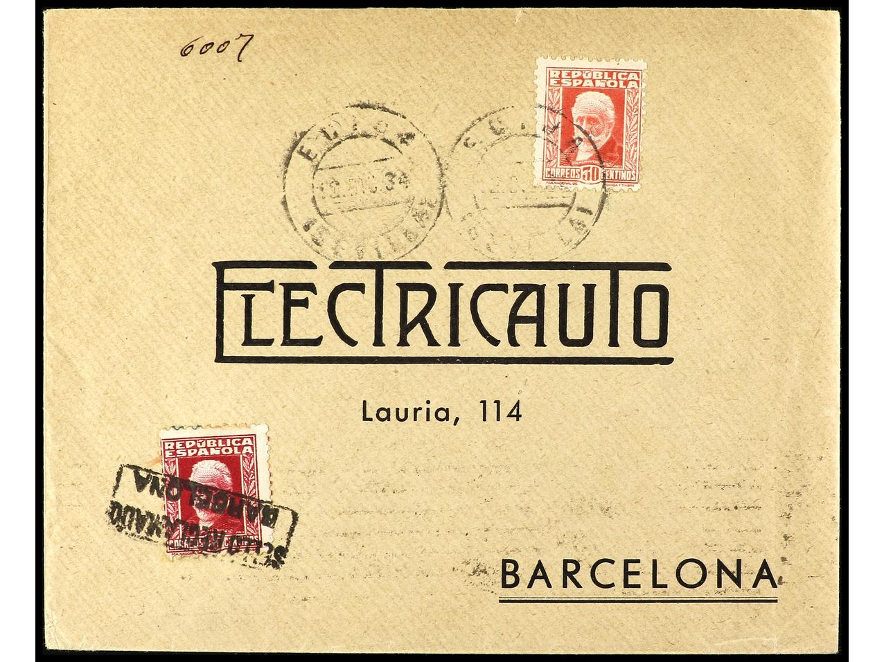 ESPAÑA. 1934. ÉCIJA a BARCELONA. 30 cts. rojo y sello de 25 cts. carmín, mat. SELLO RECLAMADO/BARCELONA. Inusual combinación. Ed.668, 669. (Image1) (Image2)