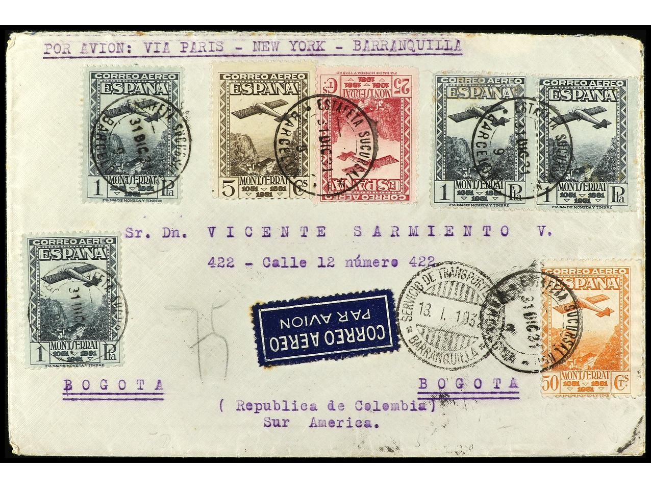 ESPAÑA. 1931. BARCELONA a BOGOTÁ. 5 cts. castaño, 25 cts. lila rosa, 50 cts. naranja y 1 pta. gris (4) circulada por Correo Aéreo vía París, New York y Barranquilla y de allí a Bogotá por la compañía Aérea S.C.A.D.T.A. Al dorso llegada.