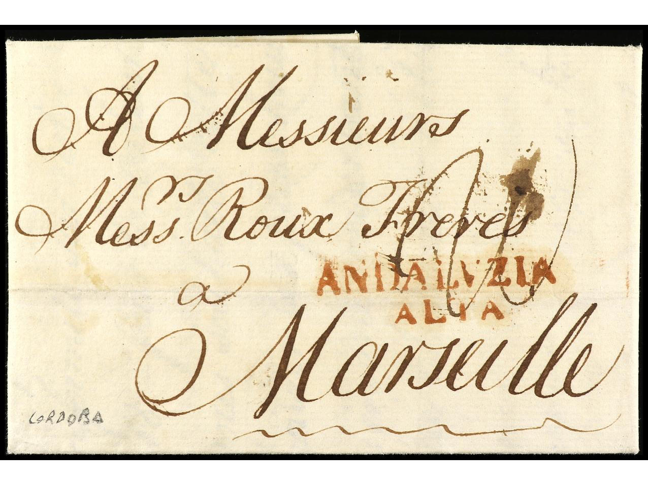 ESPAÑA: PREFILATELIA. 1780 (6 enero). CORDOBA. Sobrescrito a MARSELLA. Marca en rojo ANDALUZIA/ALTA (P.E. 3) en rojo. RARÍSIMA (ext.) y gran calidad.