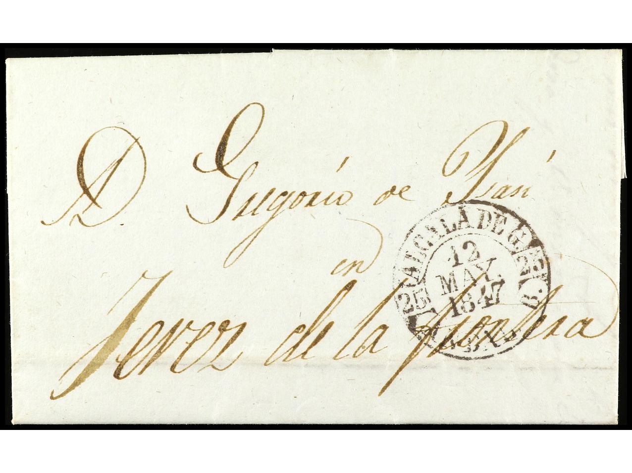 ESPAÑA: PREFILATELIA. 1847. ALCALÁ DE GUADAIRA. MAIRENA (Sevilla) a JEREZ. Fechador ALCALA DE G.(P.E. 2) en negro. No catalogado en este color. MUY RARO.