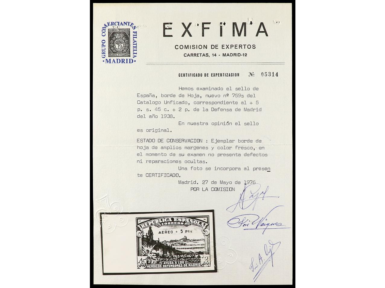 ESPAÑA. Aéreo + 5. Tipo 31. Borde de hoja. LUJO. Cert. EXFIMA (1976). Ed.759s. Cat. 1.010€. (Image1) (Image2)