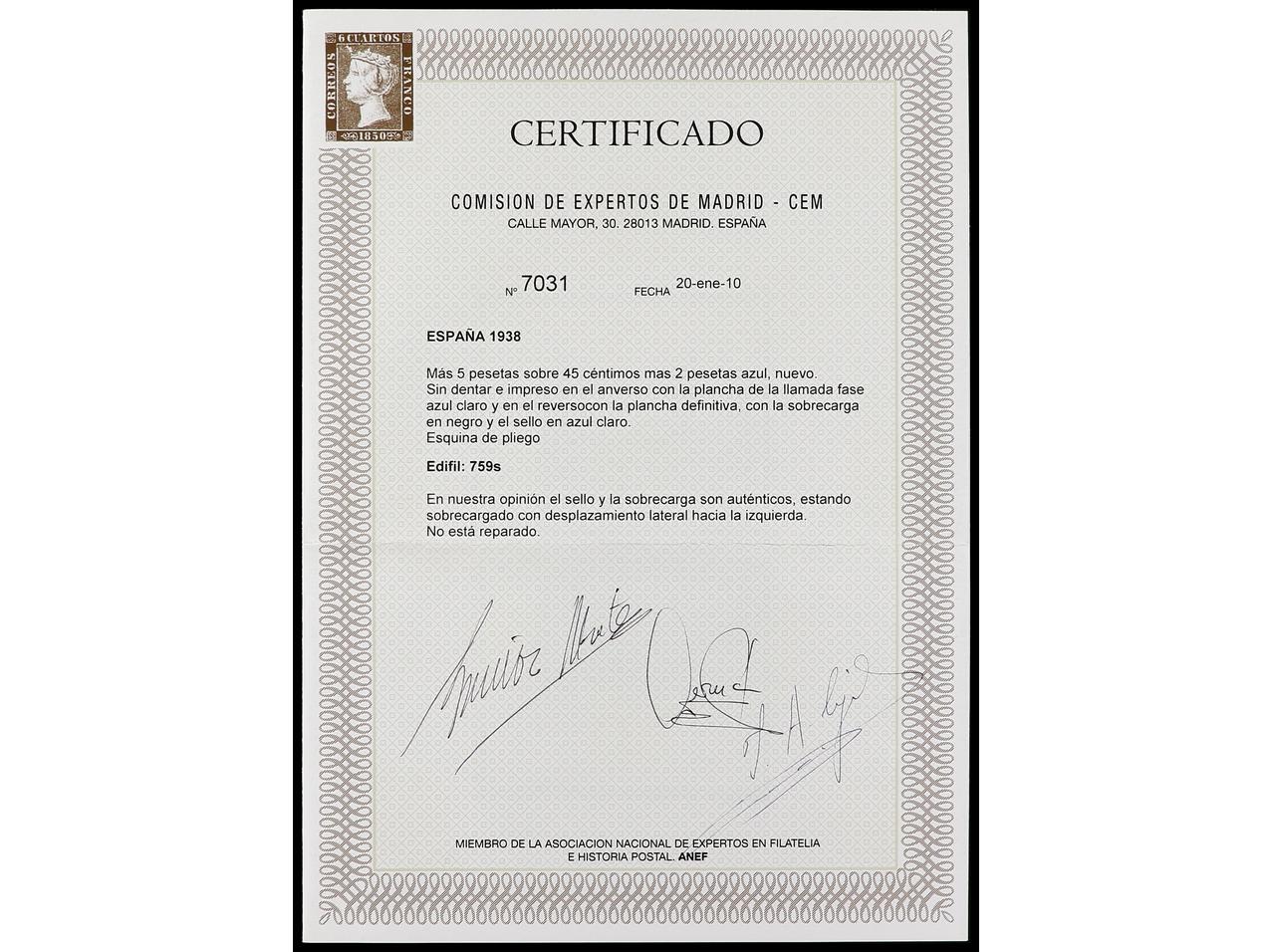 ESPAÑA. Aéreo + 5 pts. Tipo 21. LUJO. Cert. COMEX. Ed.759. Cat. 700€. (Image1) (Image2)