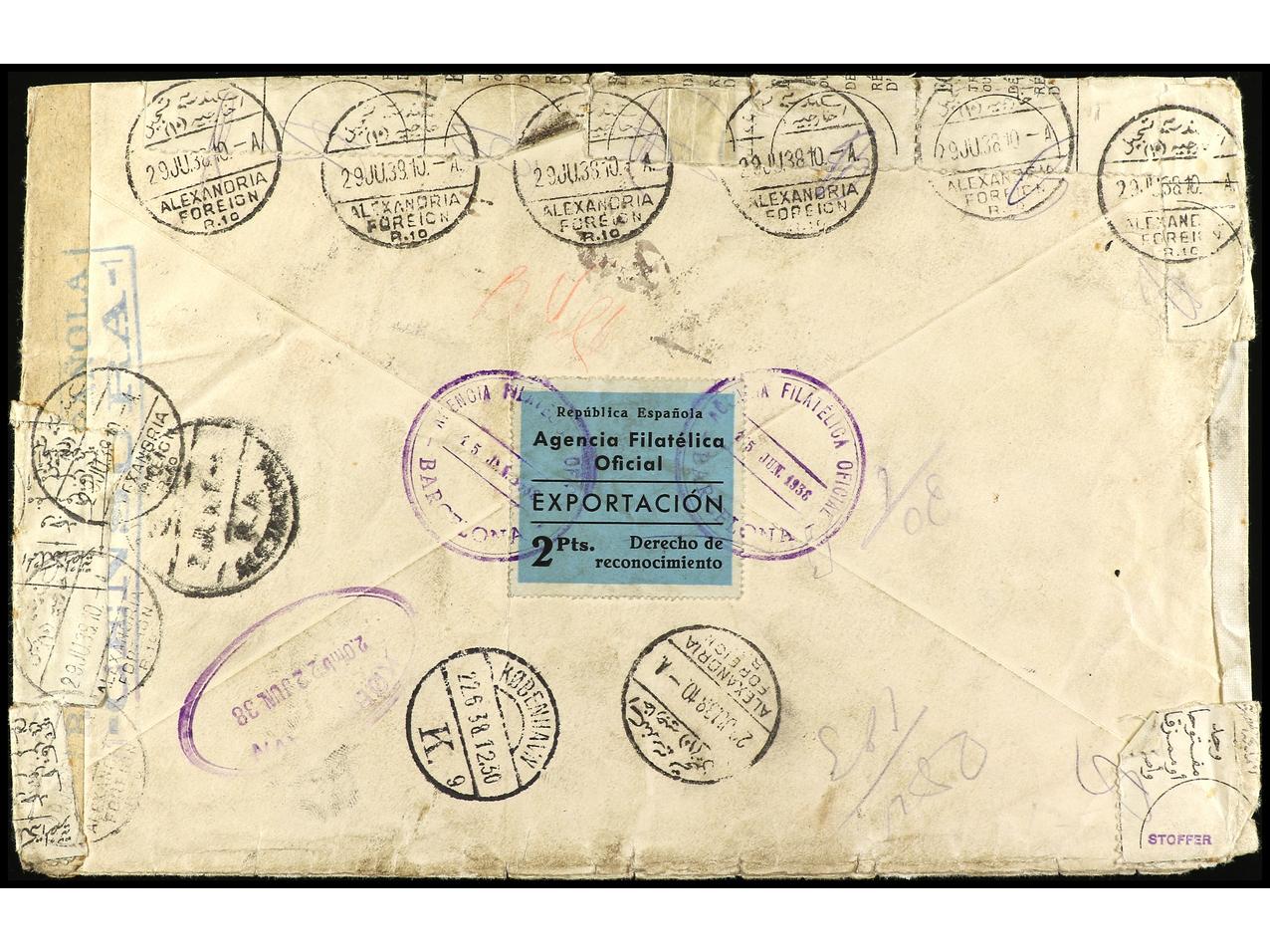 ESPAÑA. 1938. BARCELONA a DINAMARCA y reexpedida a EGIPTO. Espectacular combinación de franqueo, al dorso llegada. Ed.757, 763, 761/62, 693, 745, 752.