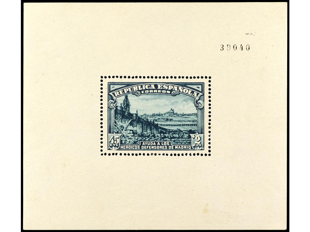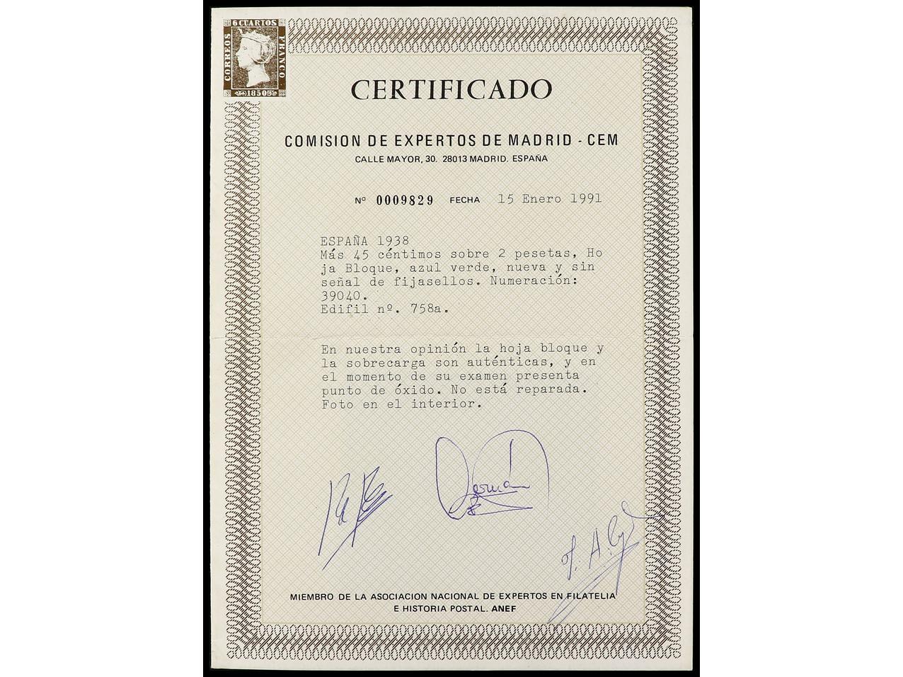 ESPAÑA. HB. AZUL VERDOSO. MUY RARA. Sólo 100 de tirada (entre los nºs 39.001 y 39.100). Cert. CEM. Ed.758a. Cat. 500€. (Image1) (Image2)