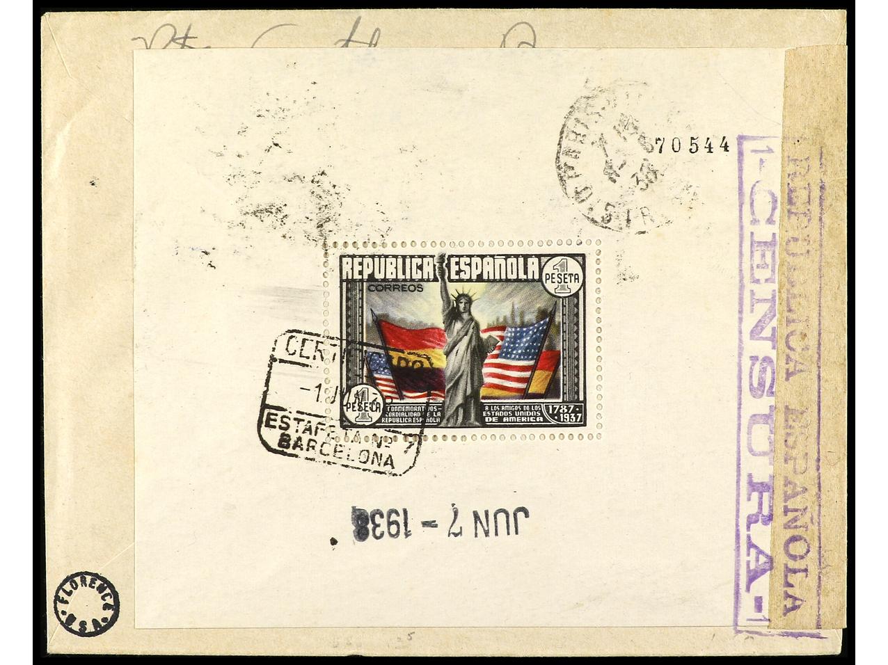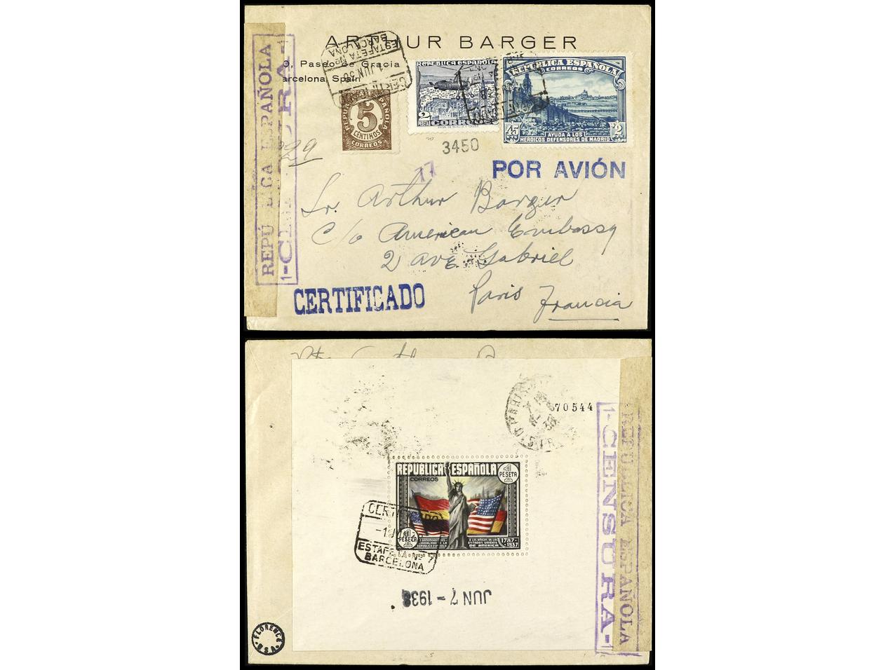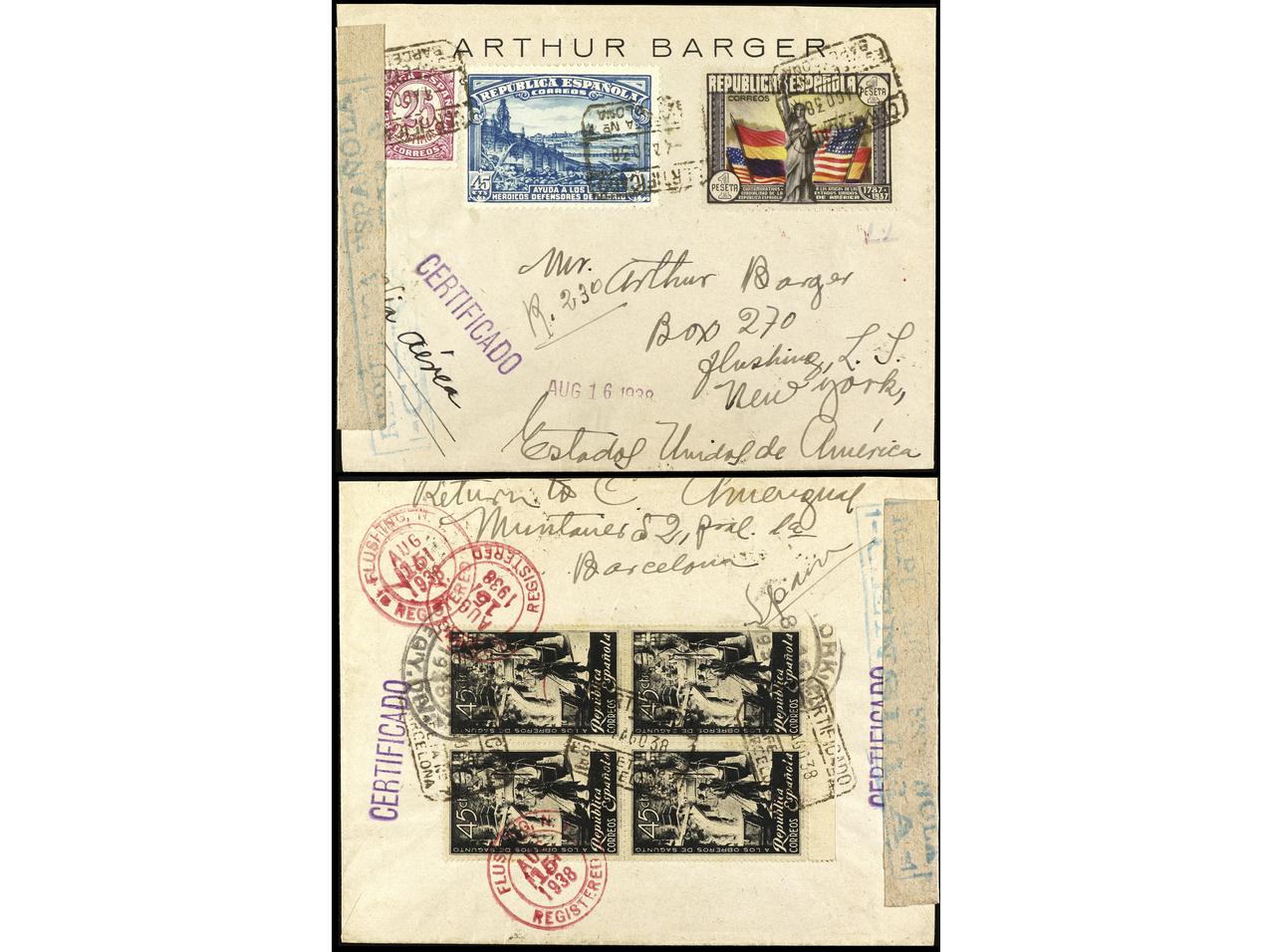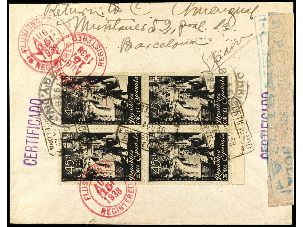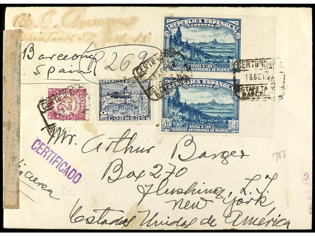 ESPAÑA. 1938. BARCELONA a NEW YORK. 45 cts. + 2 pts. azul y 1 pta. multicolor, al dorso bloque de cuatro del 45 cts. negro. Rara combinación de franqueo, al dorso llegada. Ed.757, 763. (Image1) (Image2)