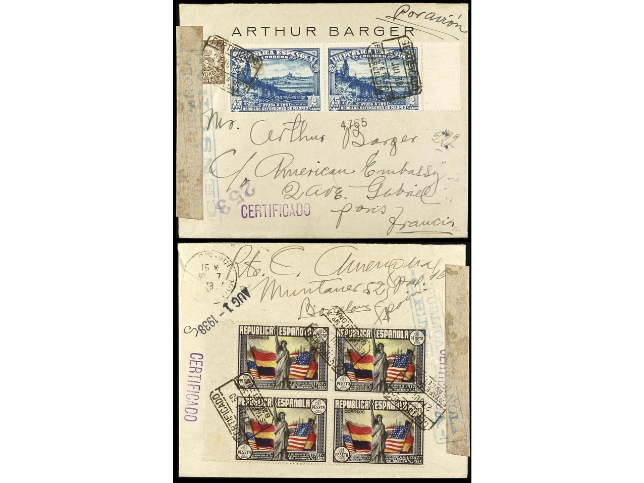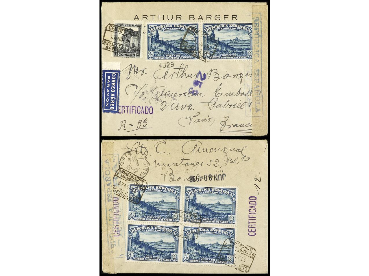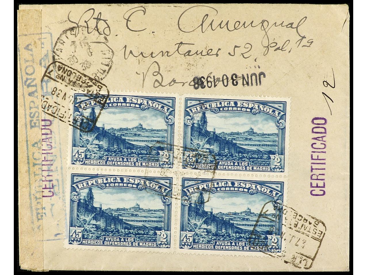 ESPAÑA. 1938. BARCELONA a FRANCIA. 45 cts. + 2 pts. azul (2) y al dorso 1 pta. multicolor en bloque de cuatro. Muy rara combinación de franqueo. Al dorso llegada. Ed.757 (2), 763 (4). (Image1) (Image2)
