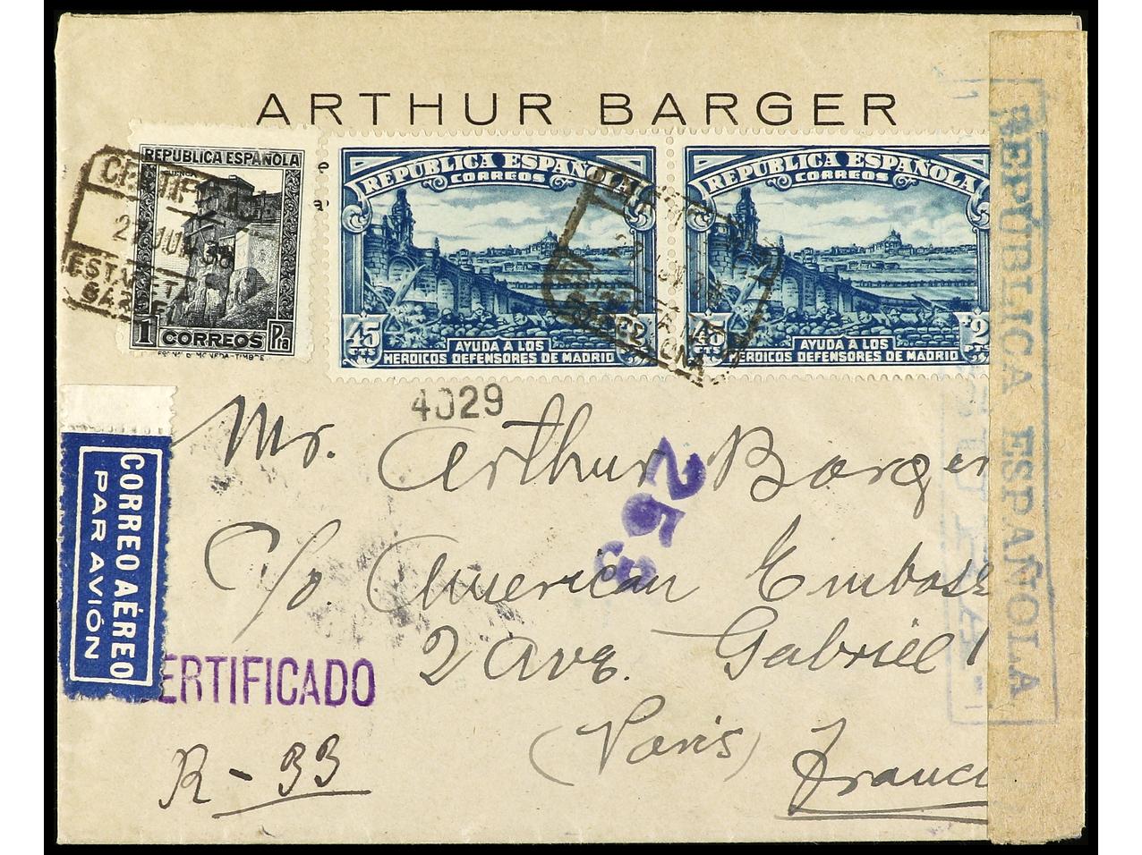 ESPAÑA. 1938. BARCELONA a FRANCIA. 45 cts. + 2 pts. azul dos en el frente y cuatro al dorso. PRECIOSA, al dorso llegada. Ed.757 (6). (Image1) (Image2)